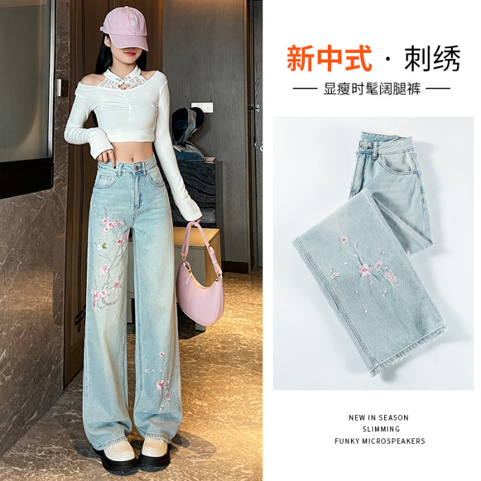 New Chinese-style embroidered wide-leg jeans for women in 2024, with a unique design sense, loose and slimming floor-length pants