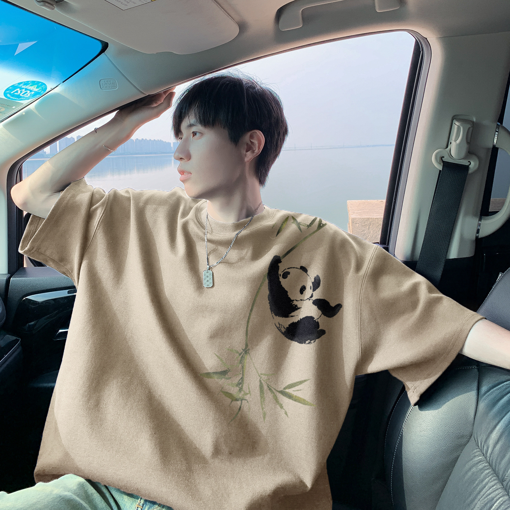 New Chinese-style short-sleeved T-shirt for men, summer American fashion brand panda bamboo print loose large-sized half-sleeved T-shirt