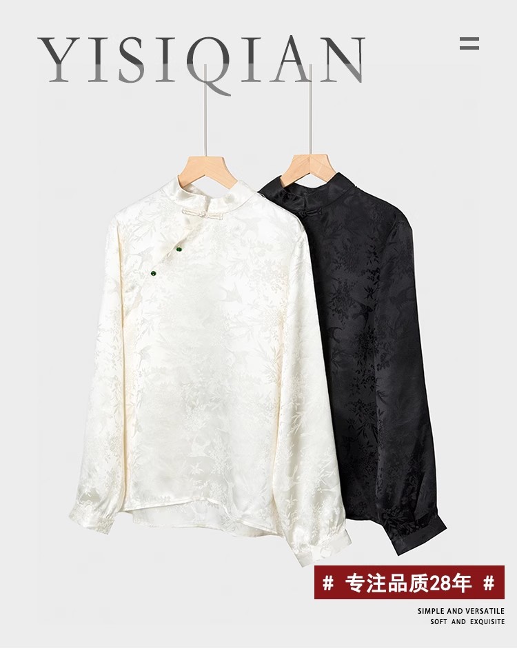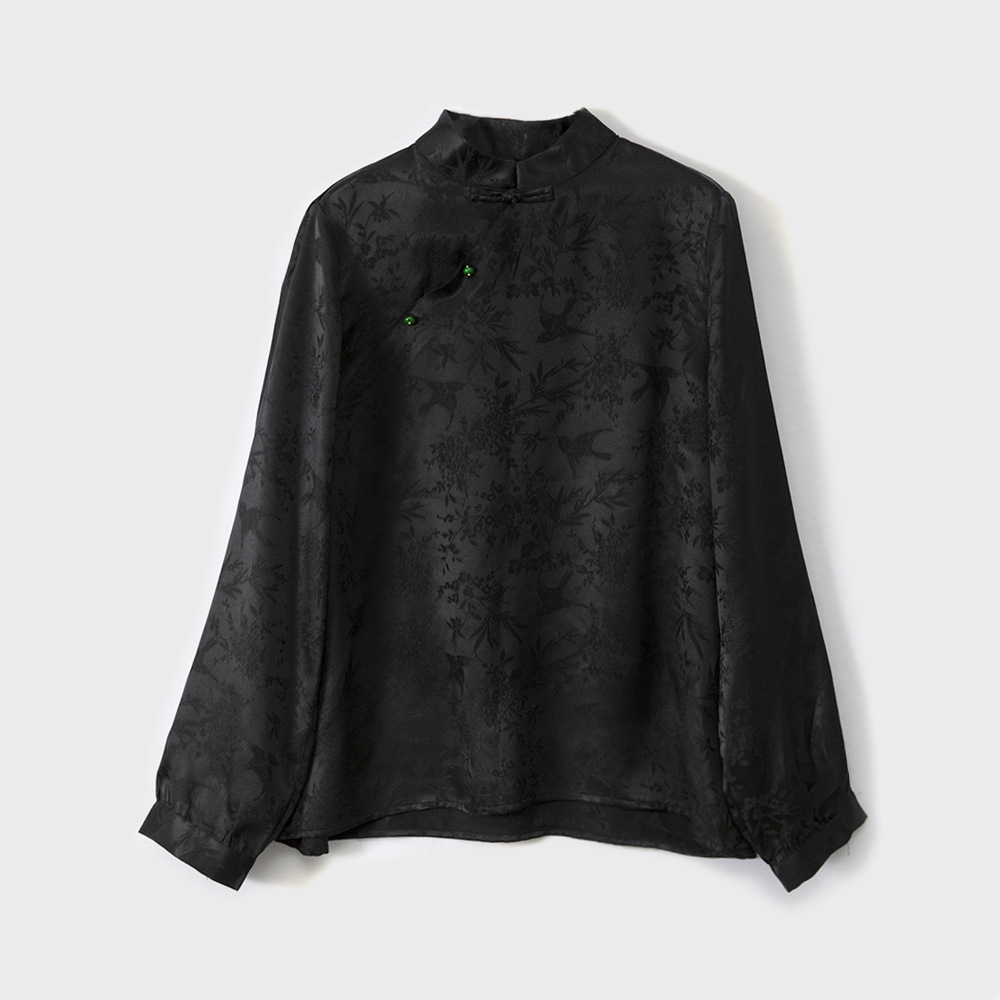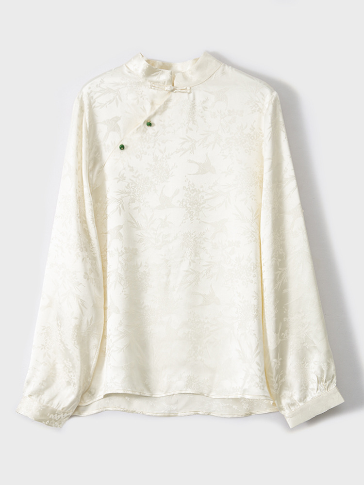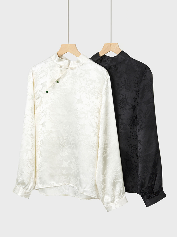 New Chinese-style top, women's base layer, mulberry silk, retro stand-up collar, slanted front, silk shirt, jacquard long-sleeved new style