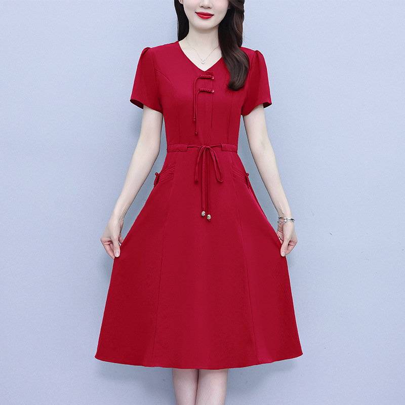 New Chinese-style V-neck dress for women in summer 2024, a mid-length, stylish, waist-cinching and slimming dress for middle-aged mothers