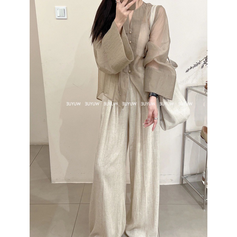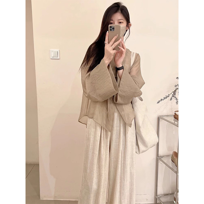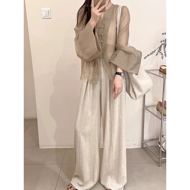 New Chinese-style women's clothing set for summer, featuring a cool button-down sun-protective shirt and wide-leg pants with a drape