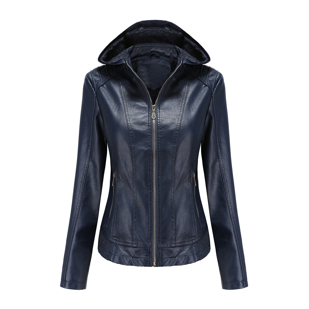New cross-border autumn and winter women's detachable hooded leather jacket with fleece warmth jacket 6634