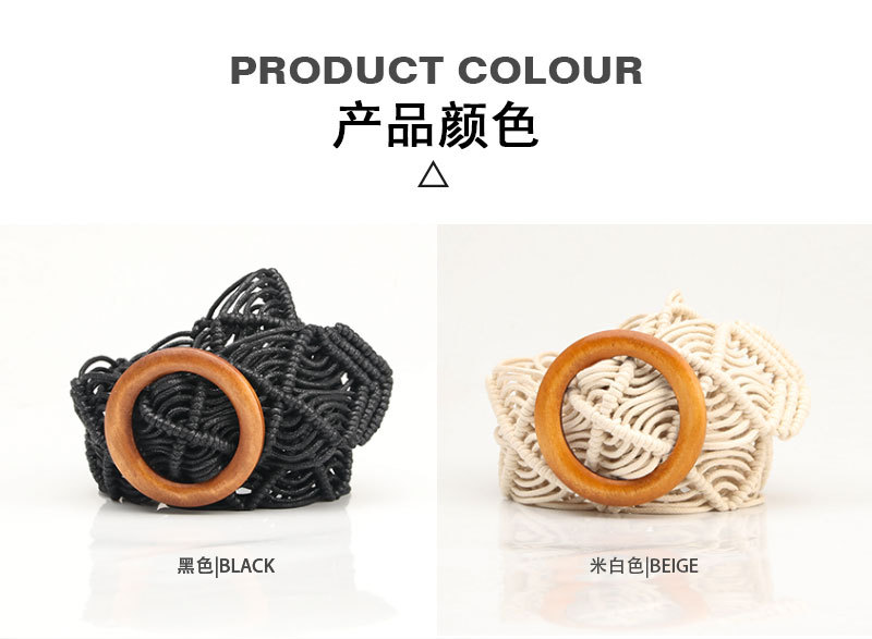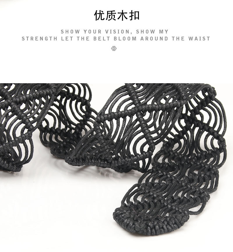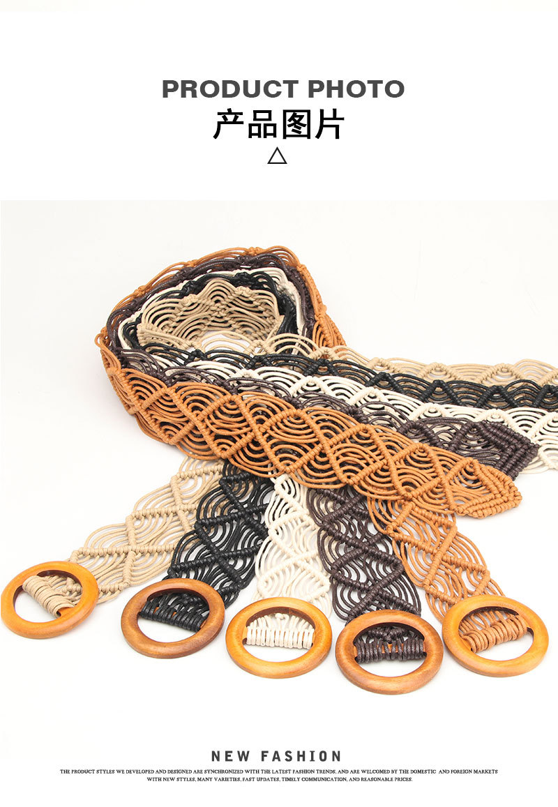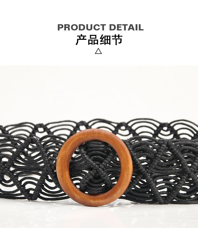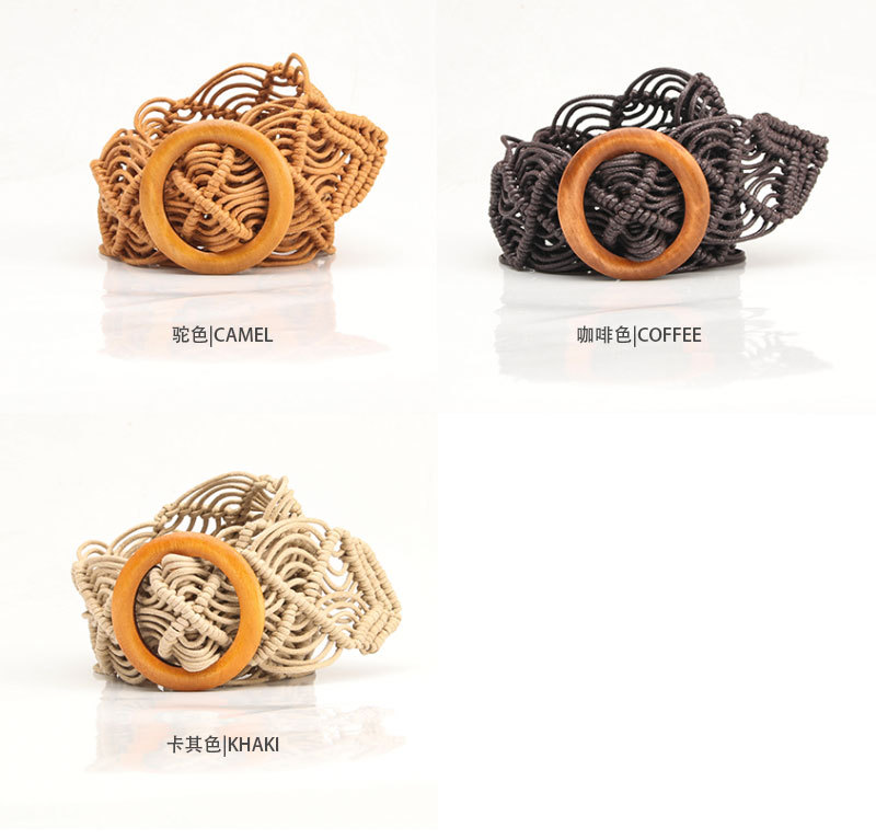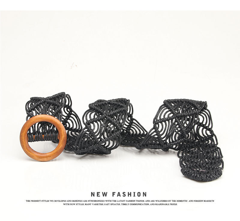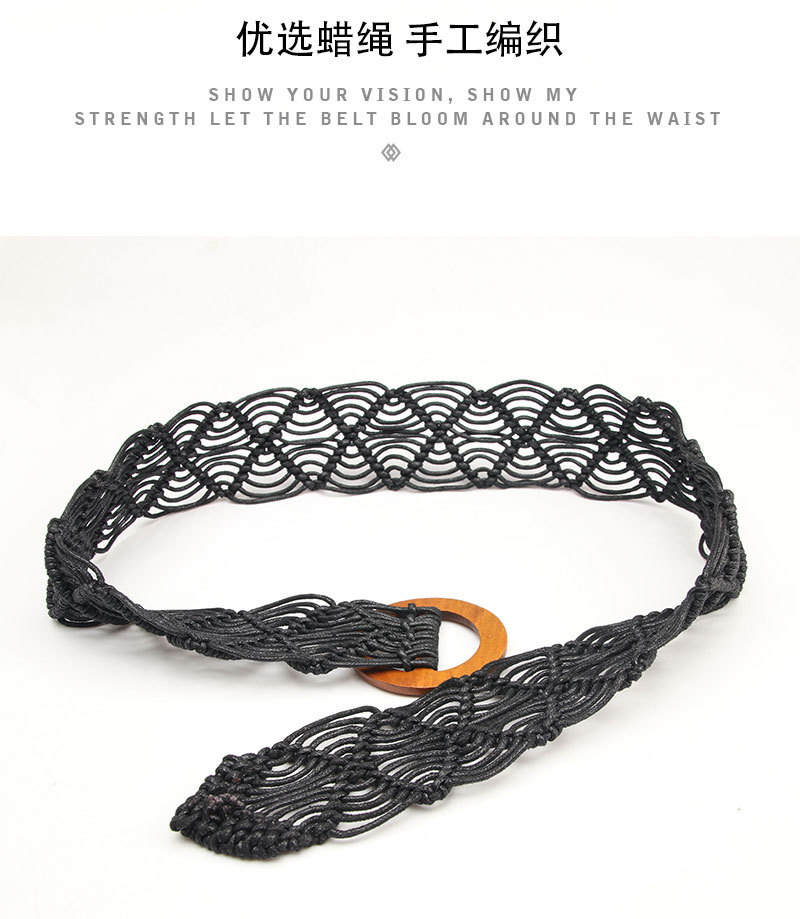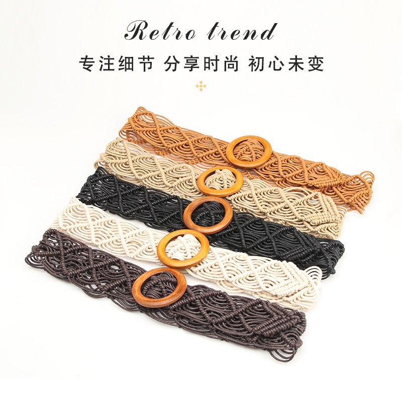 New ethnic-style women's wax rope woven belt decorative skirt belt, pure hand-woven hollowed-out wooden buckle belt