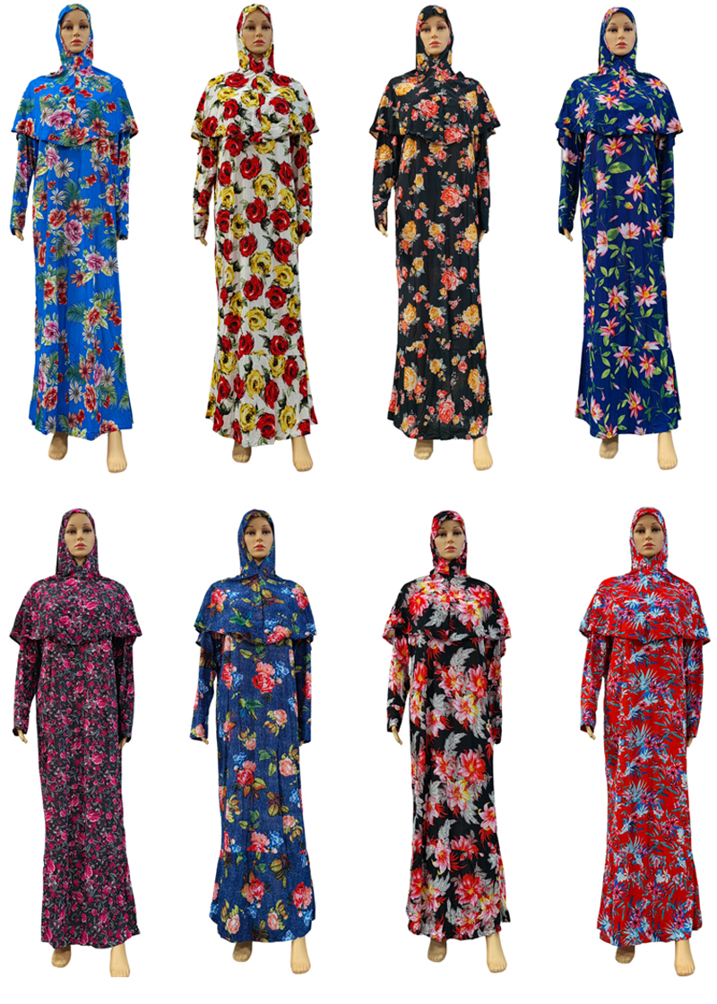 New fashionable and best-selling women's Muslim-printed small floral wish body-hugging dress, long dress, headscarf and long robe two-piece set