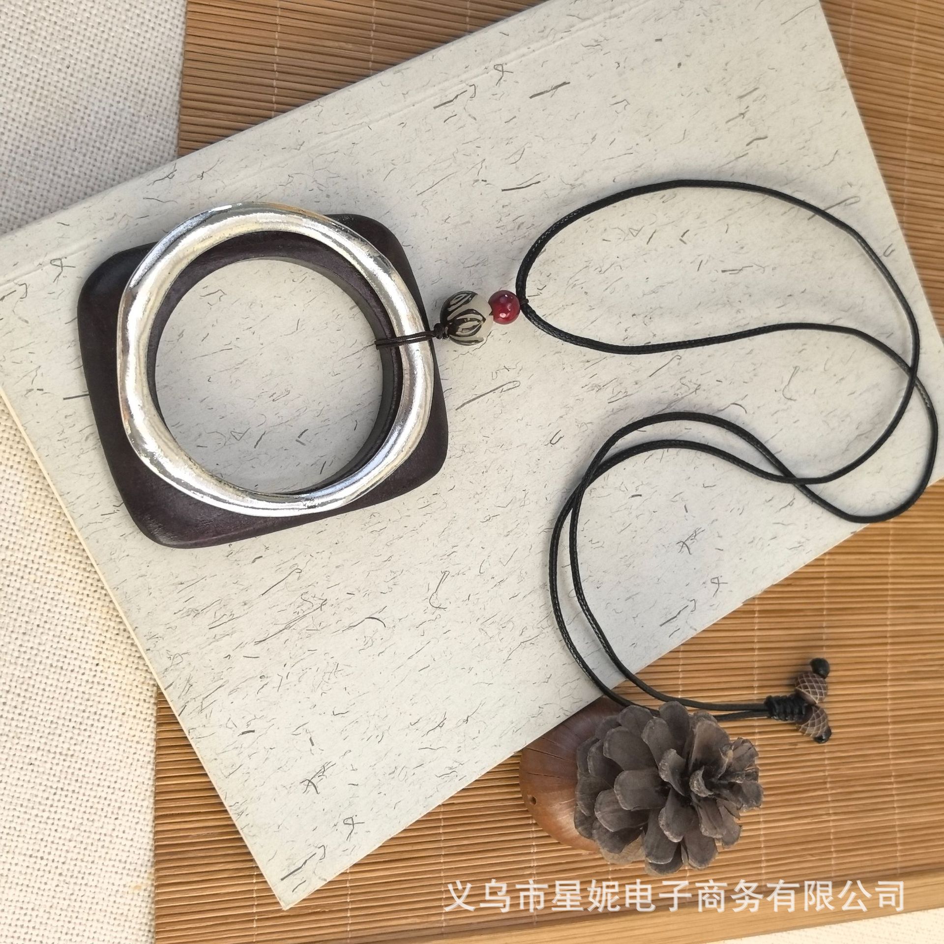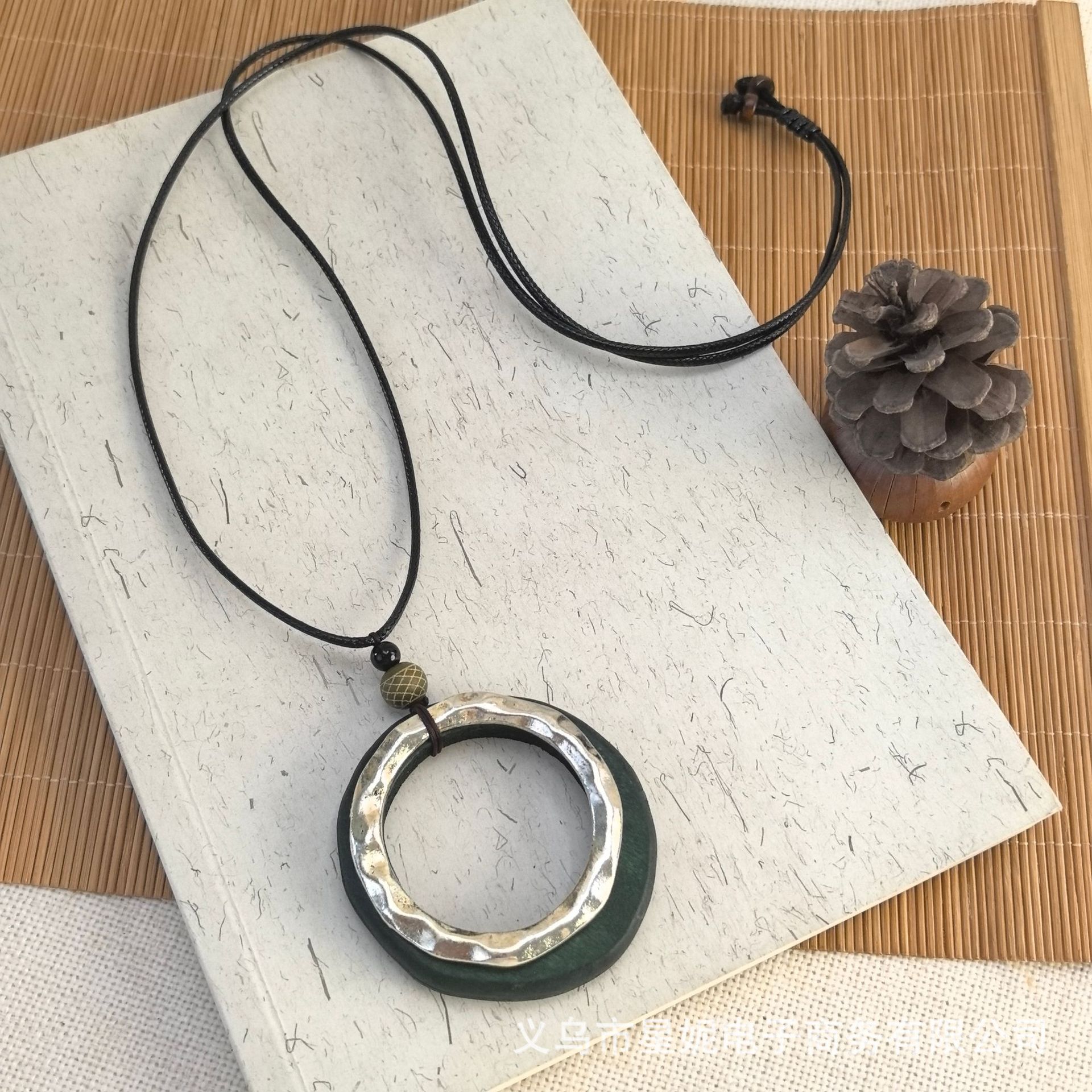 New foreign trade sandalwood alloy ring, retro leather rope, sweater chain, cotton and linen clothing pendant, long women's necklace