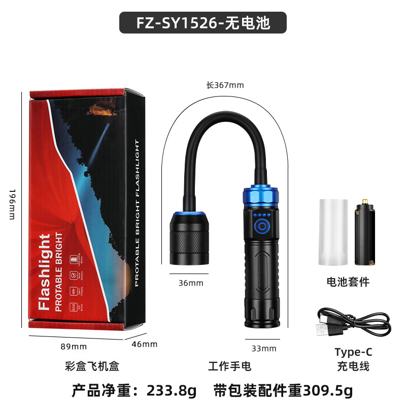 New high-intensity flashlight, rechargeable, ultra-bright, long-range, zoom, bendable, electric display, aluminum alloy main body work light