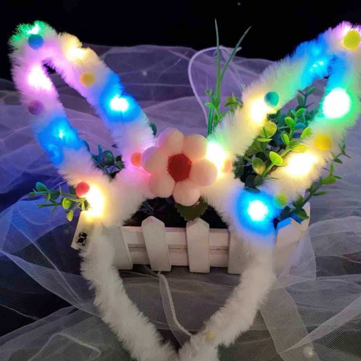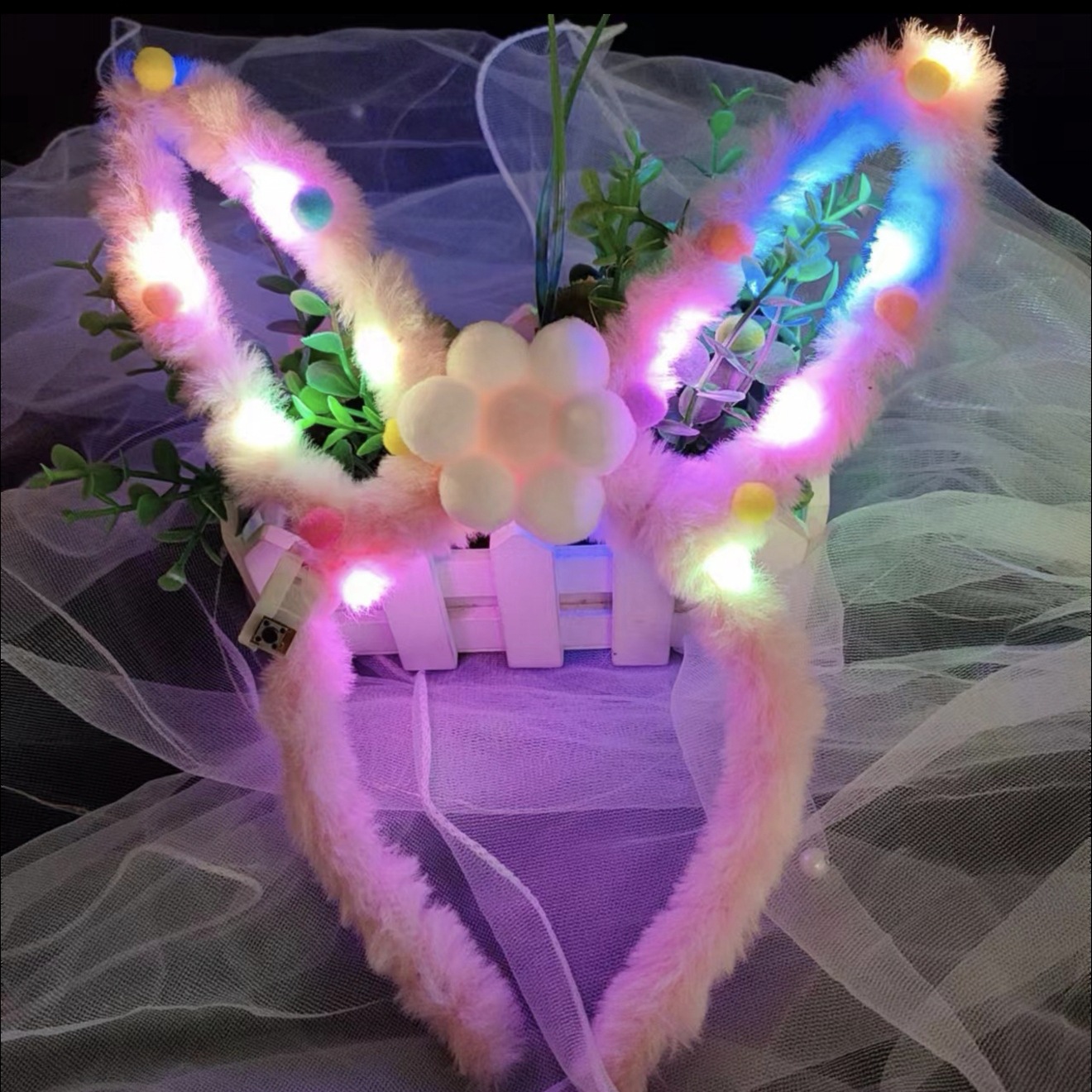 New illuminated toy, night market street stall, 14-light, all-fur rabbit ear children's hair band