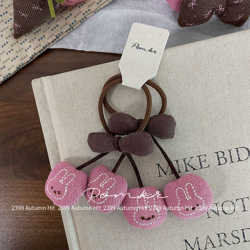 New Korean-style autumn pink coffee bow hair clips, children's color-blocking side wavy bangs clips, elastic ponytail hair bands