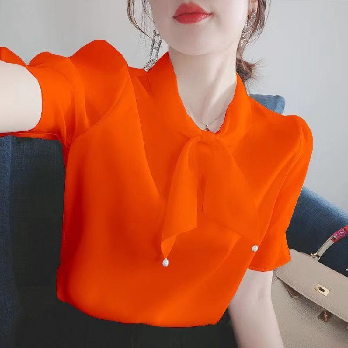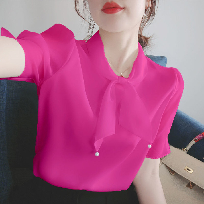 New Korean-style chiffon blouse for women in summer, stylish bow mini blouse
