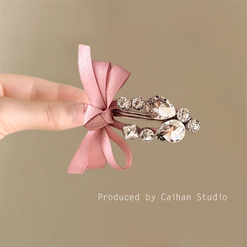 New Korean sweet ribbon bow, rhinestone duckbill hair clip, super fairy-like bangs clip, side clip hair accessory for women