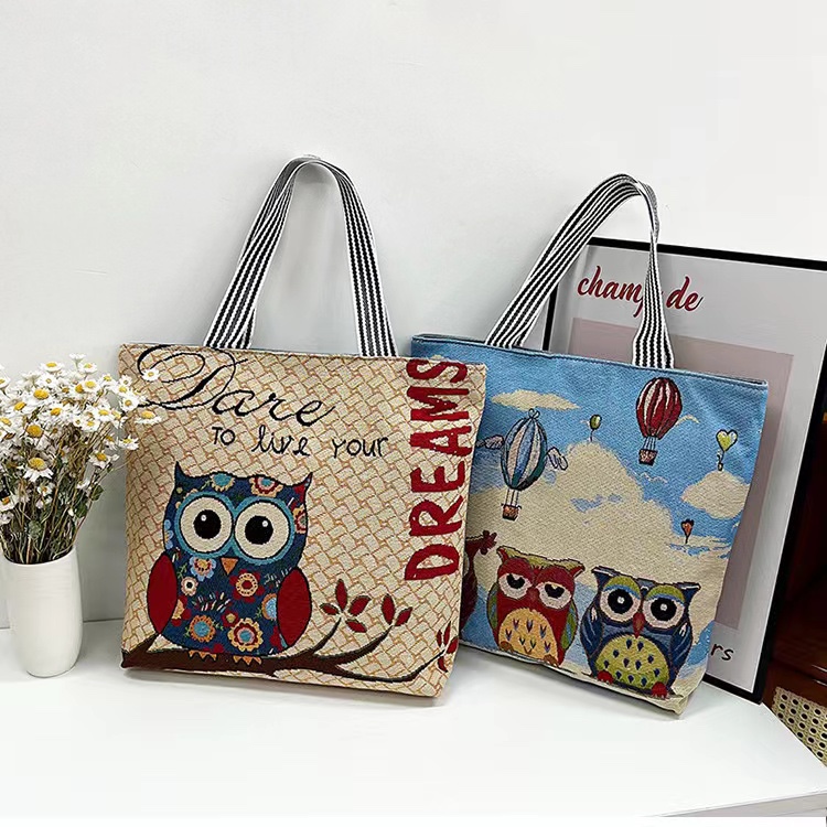 New linen jacquard large shoulder bag, women's casual and versatile single-shoulder bag, shopping bag for going out, Thai style owl tote bag