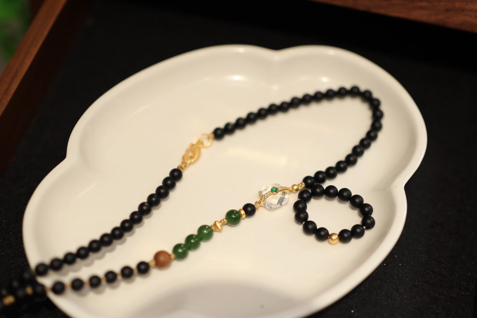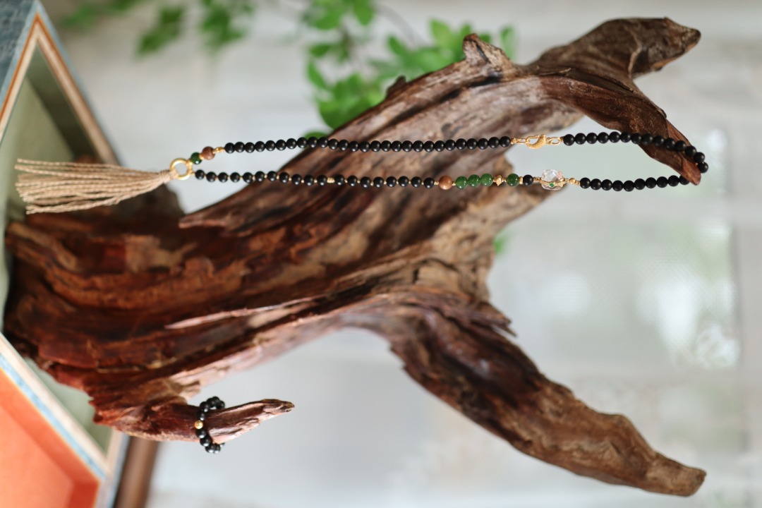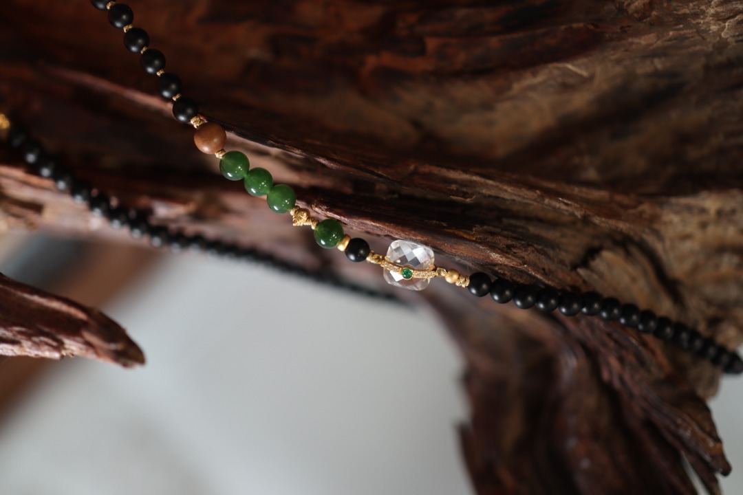 Necklace: 985 silver gold-plated with white crystal, jasper, old sandalwood, 925 silver gold-plated beads, 925 silver gold-plated rings, 925 silver gold-plated accessories, matte black agate Ring: 985 silver gold-plated, matte black agate, 6 yuan |