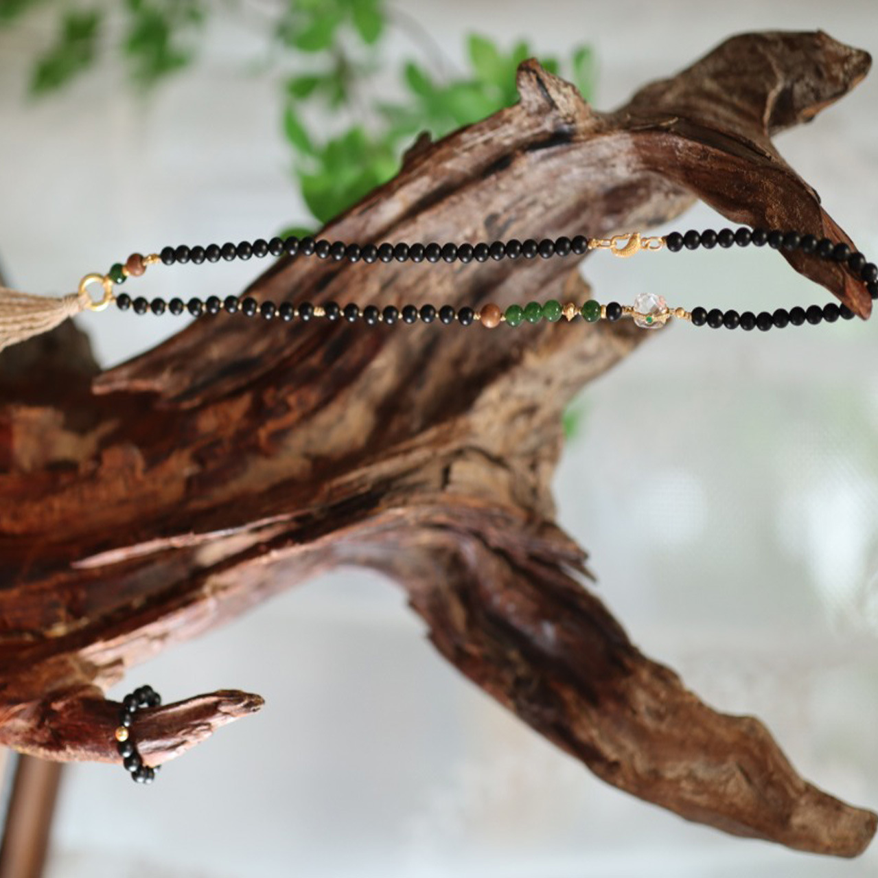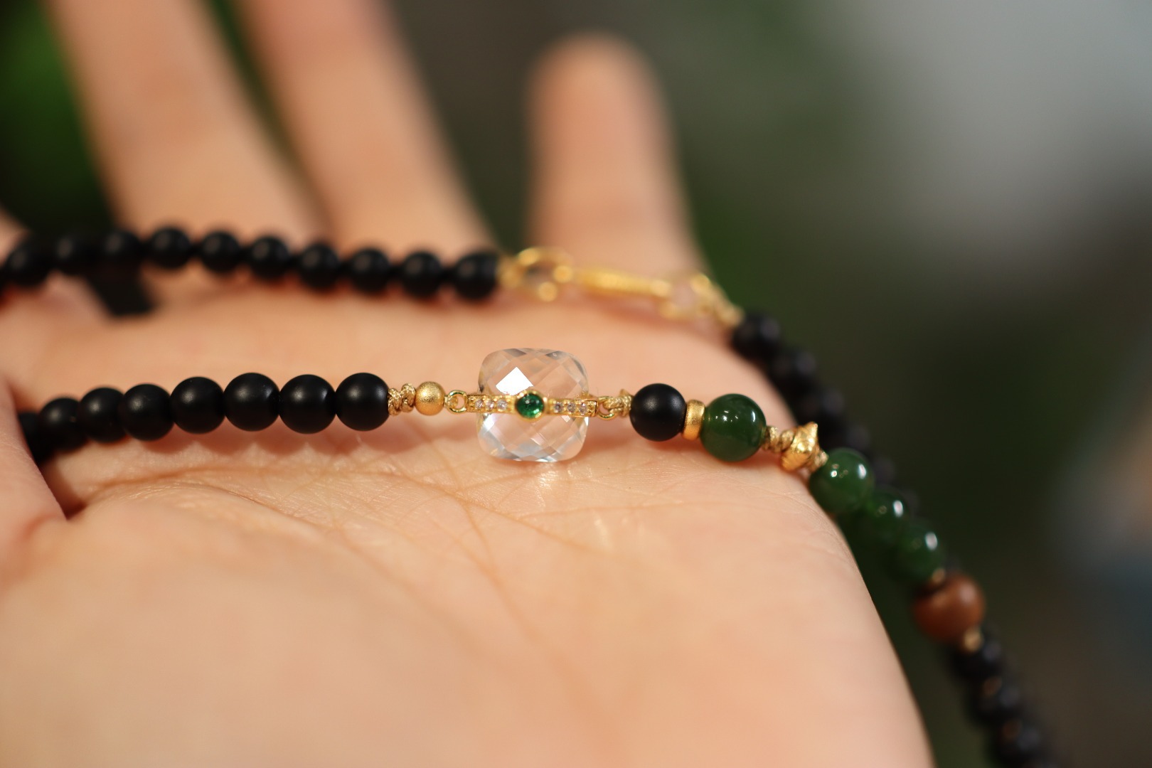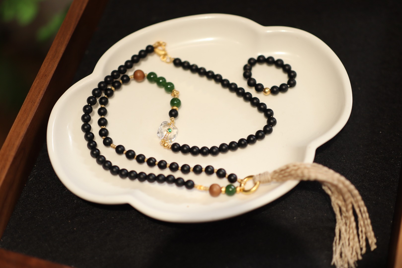 Necklace: 985 silver gold-plated with white crystal, jasper, old sandalwood, 925 silver gold-plated beads, 925 silver gold-plated rings, 925 silver gold-plated accessories, matte black agate Ring: 985 silver gold-plated, matte black agate, 6 yuan |