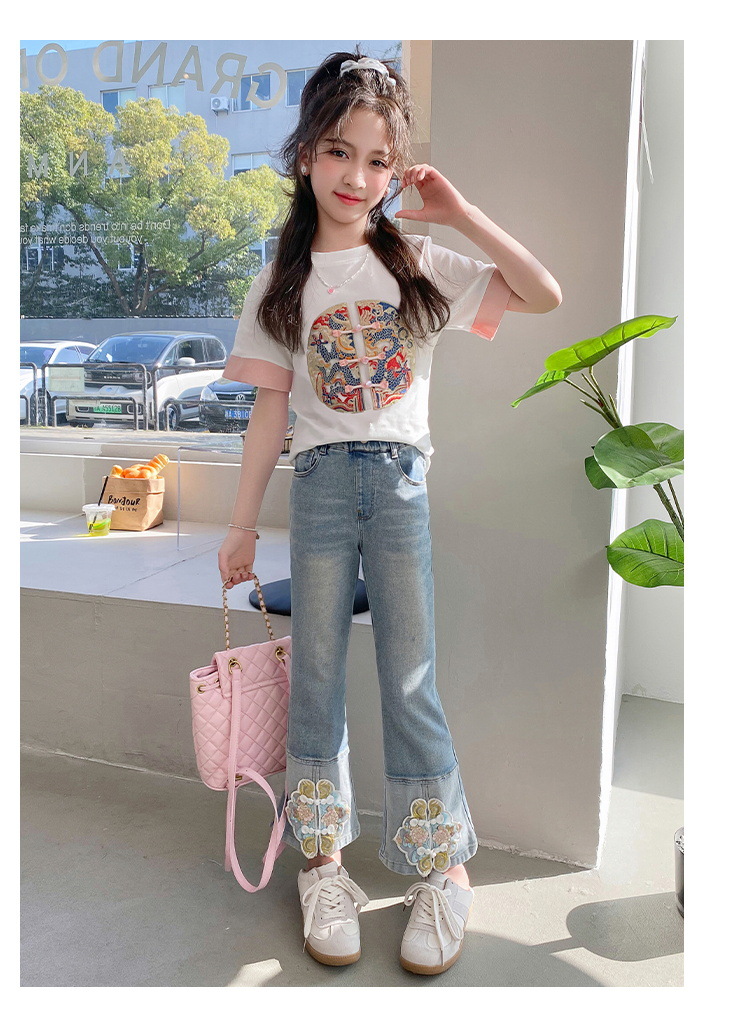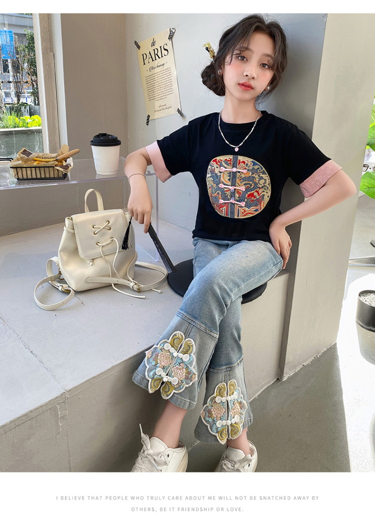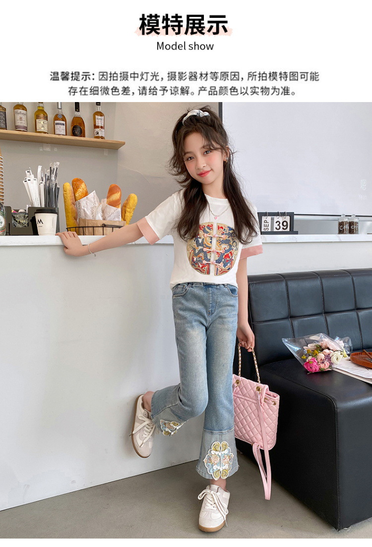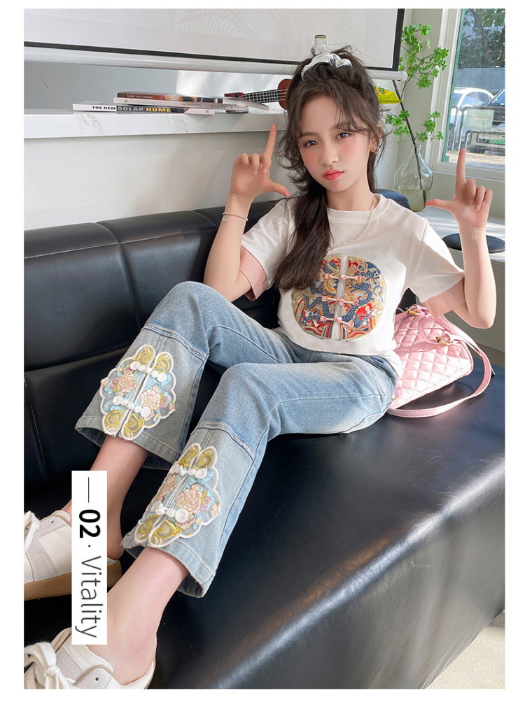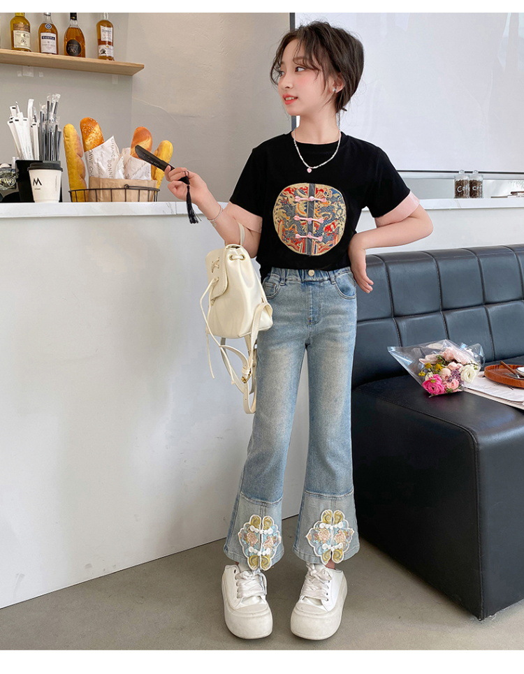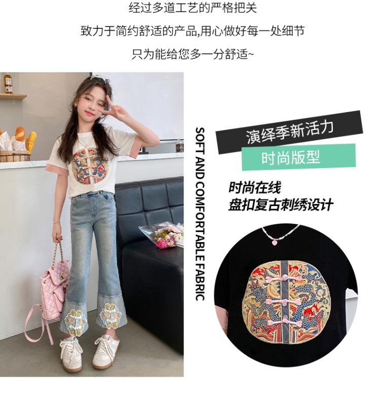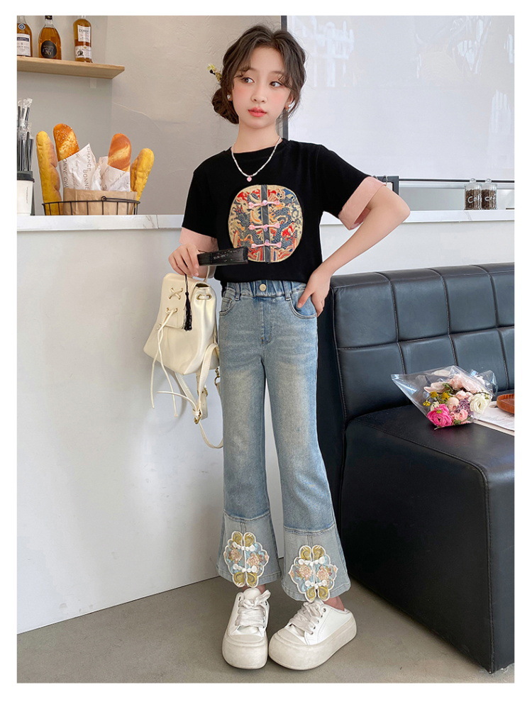 New Spring/Summer 2024 Girls' jeans with Chinese embroidery, new Chinese style and ancient style children's flared pants