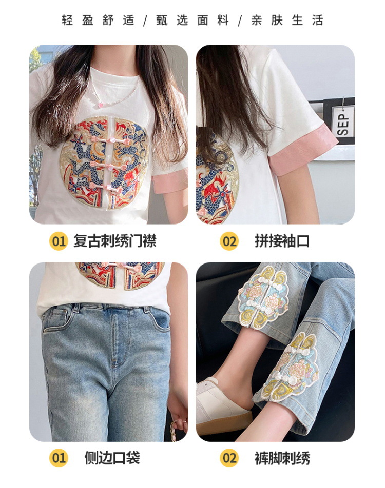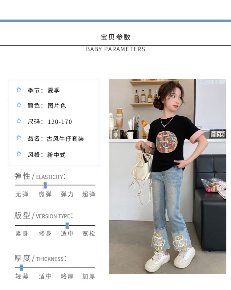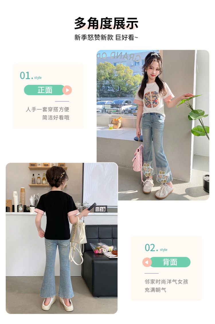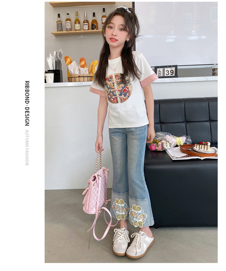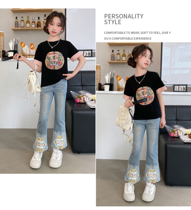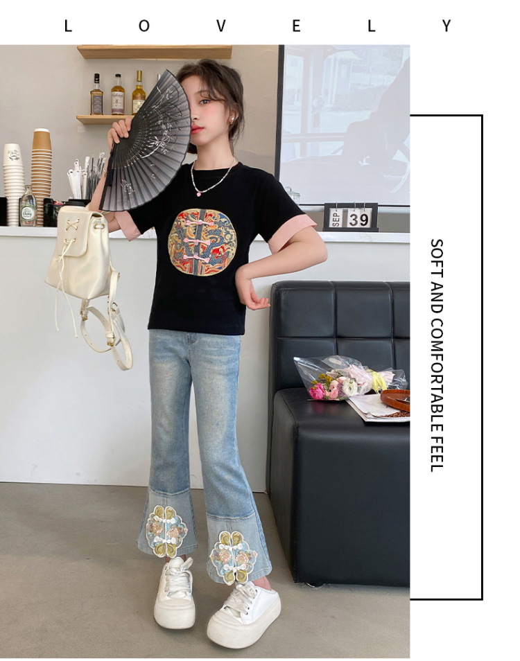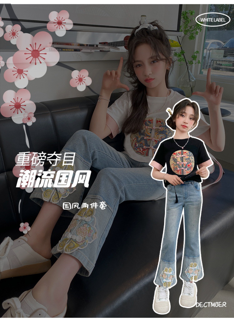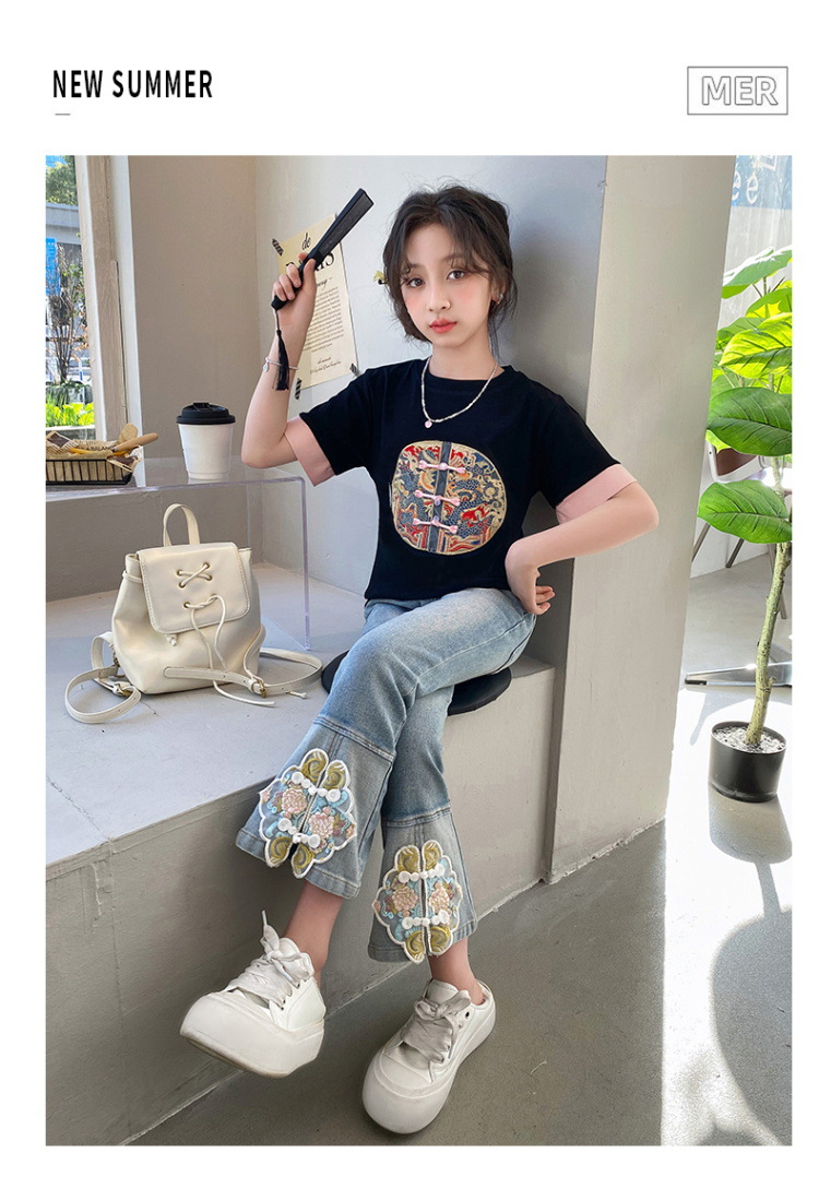 New Spring/Summer 2024 Girls' jeans with Chinese embroidery, new Chinese style and ancient style children's flared pants