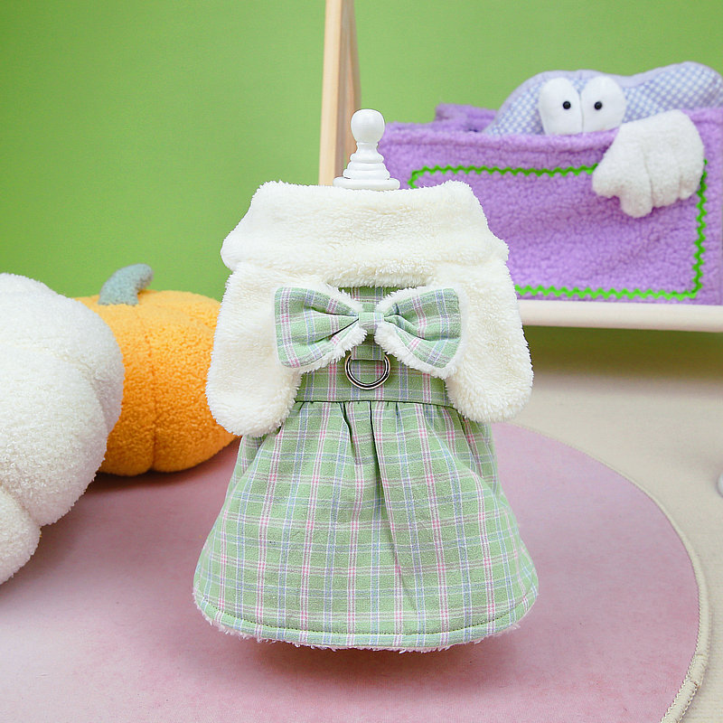 New sweet and ladylike checkered cotton dress for pet clothing in autumn and winter, cat dress that can be hung and pulled, 23 White Rabbit cotton dress