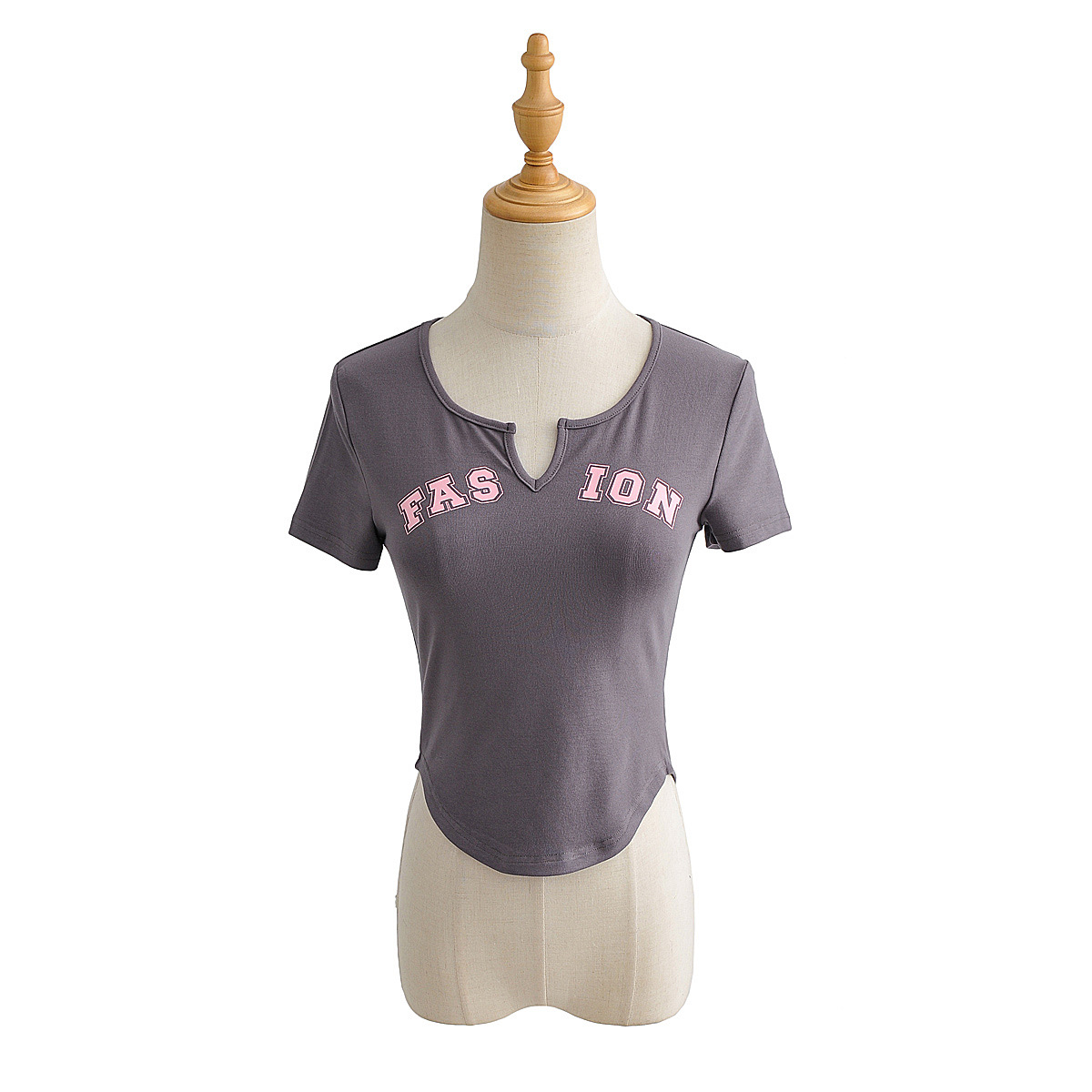 New V-neck letter-shaped short-sleeved European and American style women's clothing, printed arc-shaped hem tight T-shirt, elastic top