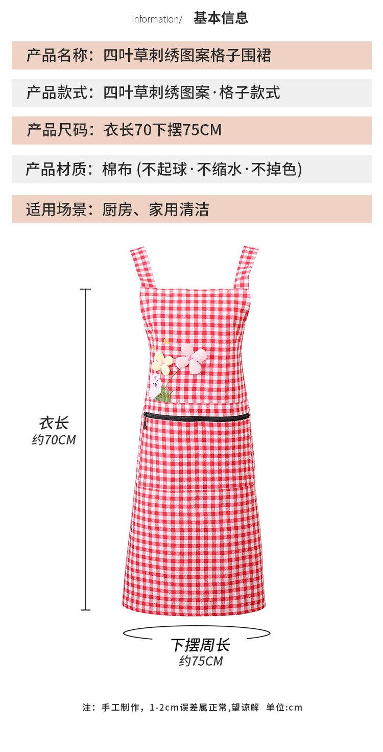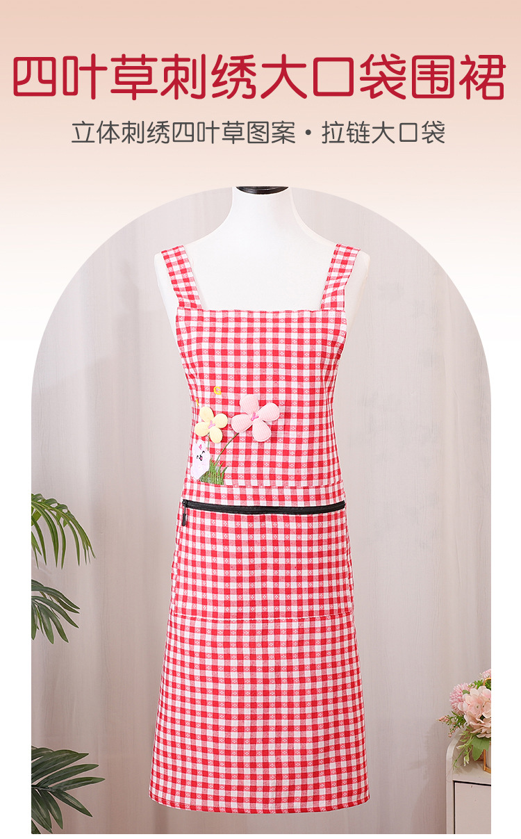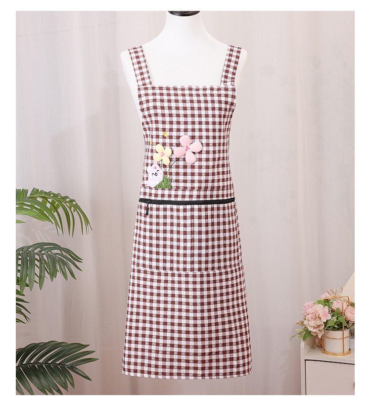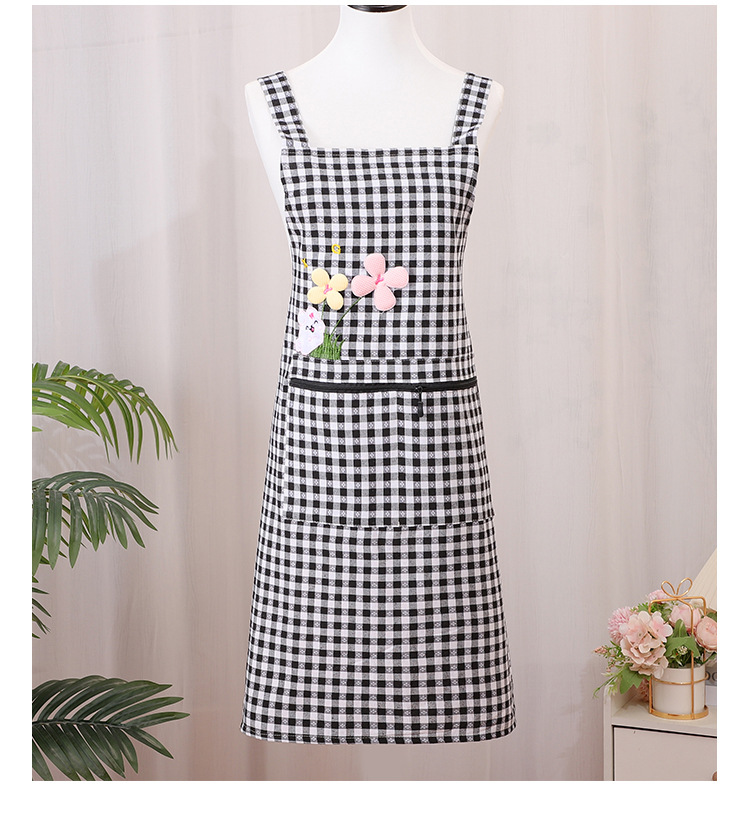 New women's kitchen and home apron with embroidered large pockets, oil-proof checkered zipper, shoulder strap and waistband, suitable for other categories