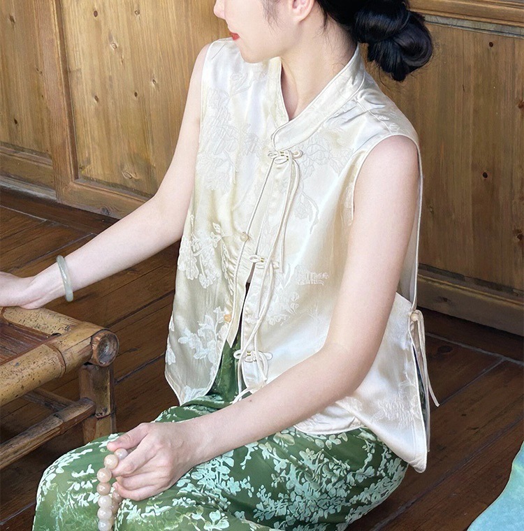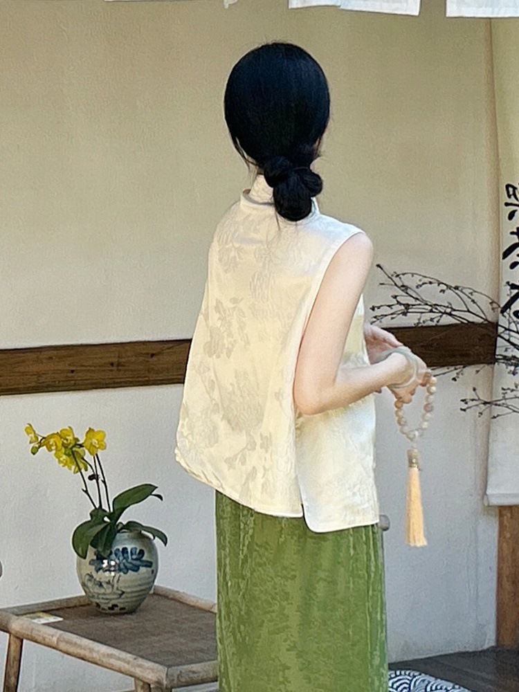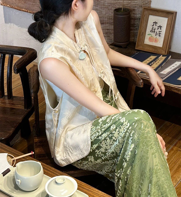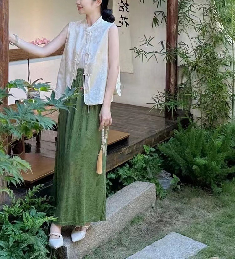 Nk New Chinese-style women's clothing, light national style top, button-up vest, Zen old money style, green two-piece set, half skirt, summer