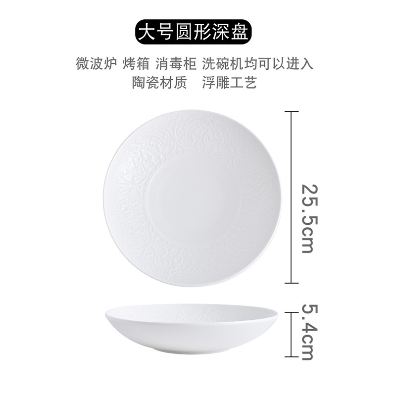 Nordic tableware, solid-color creative lace ceramic bowl, LOGO embossed Western steak plate, round deep plate, for home use