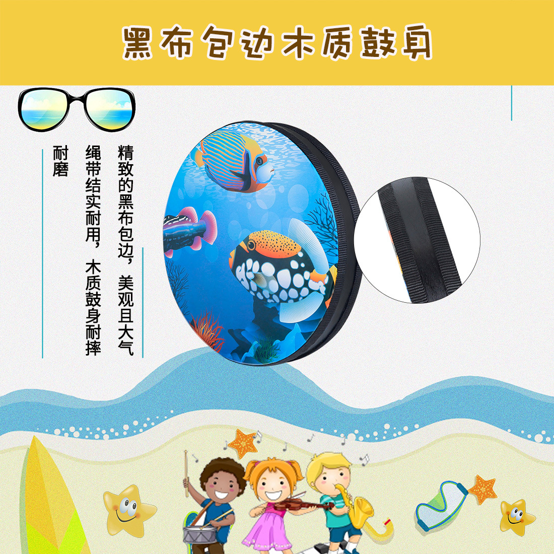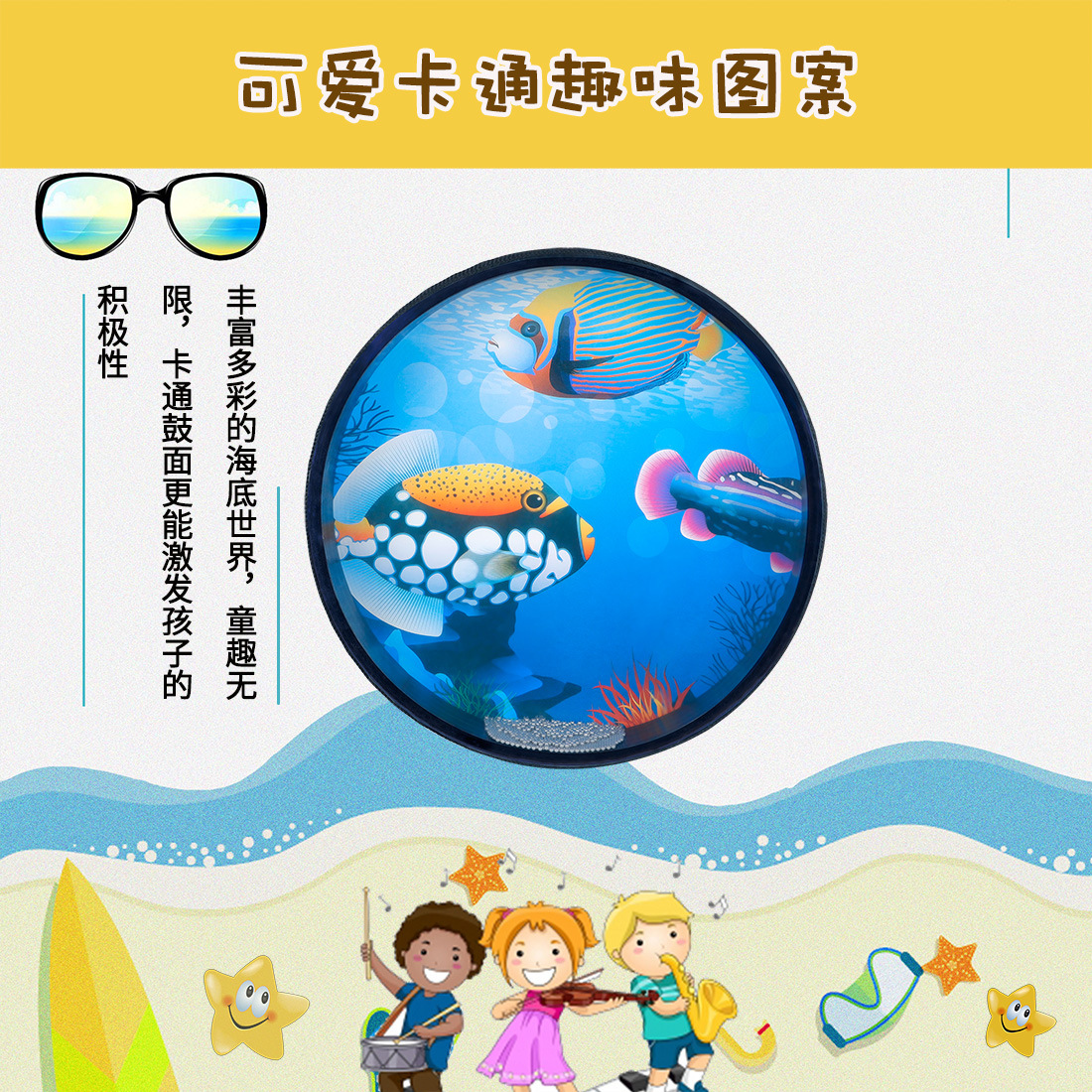 | Selling points: The cartoon and interesting underwater world pattern suits children's preferences. The built-in metal steel balls make a sound like waves when rolling, which is pleasant and melodious. The black edge is exquisite and durable. The solid wood drum edge is resistant to drops and wear. The transparent polyester drum surface is healthy, environmentally friendly and has a good visual effect |