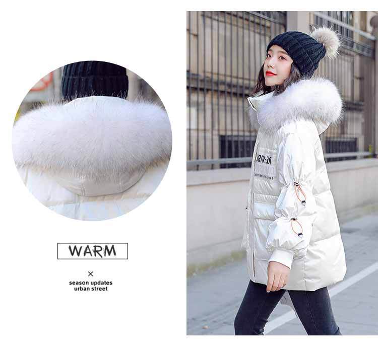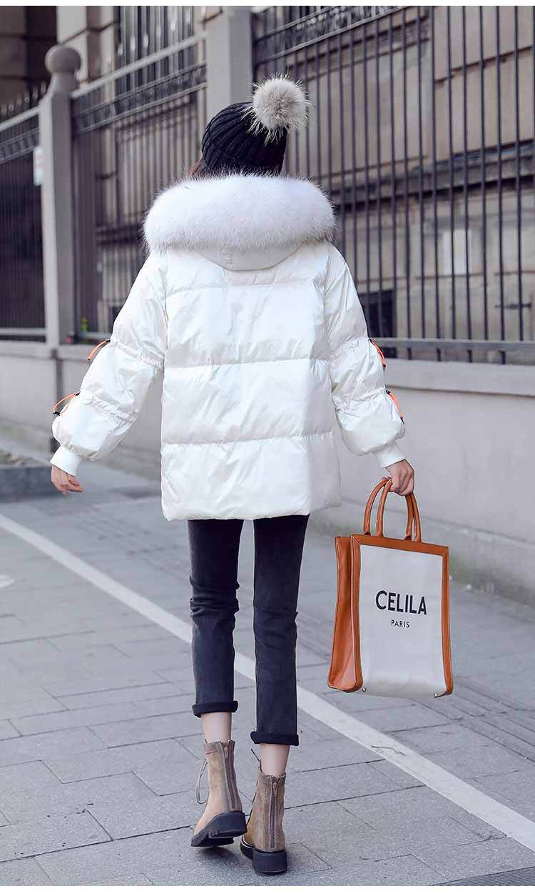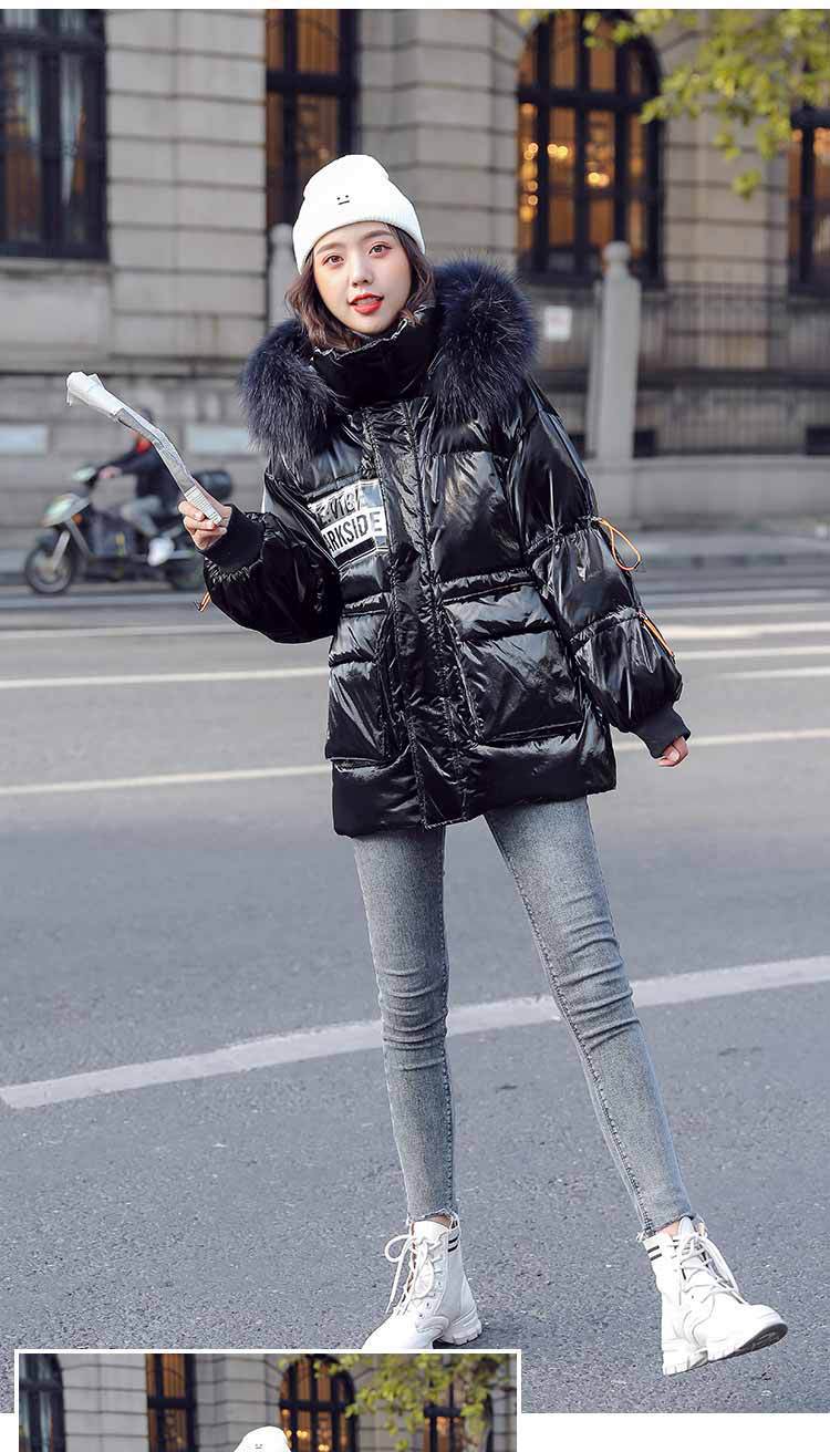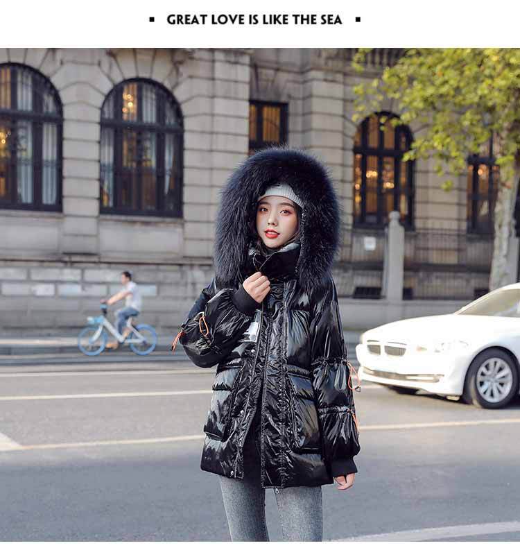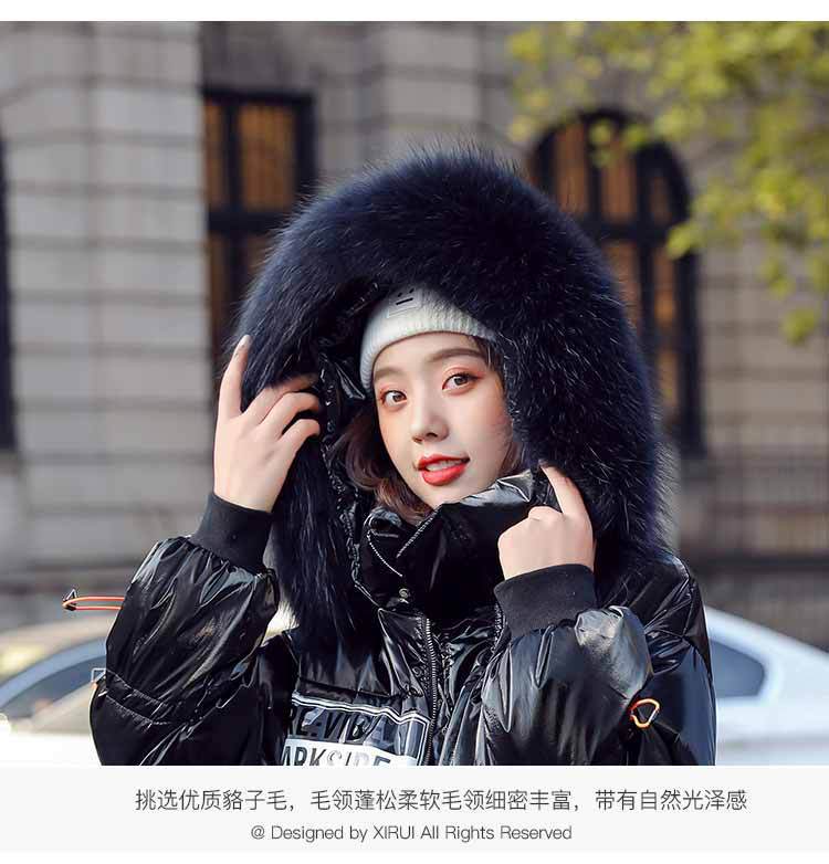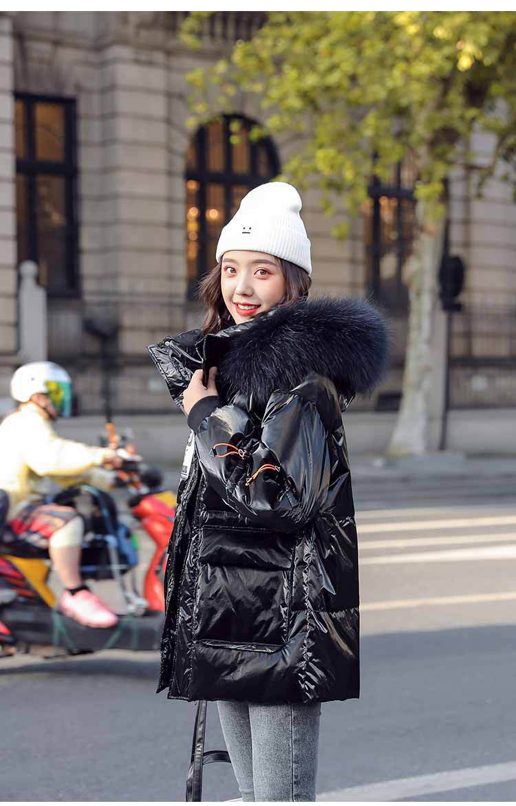 Out-of-season new Korean style patent leather glossy thickened loose 貉子 large fur collar drawstring personalized down jacket for women 's fashion