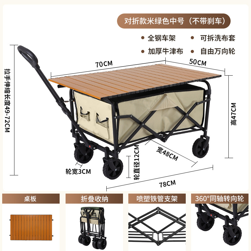Rear-folding large 10-inch tank wheel khaki/dual brakes + height-increasing and lengthened dual-purpose table + sunshade umbrella