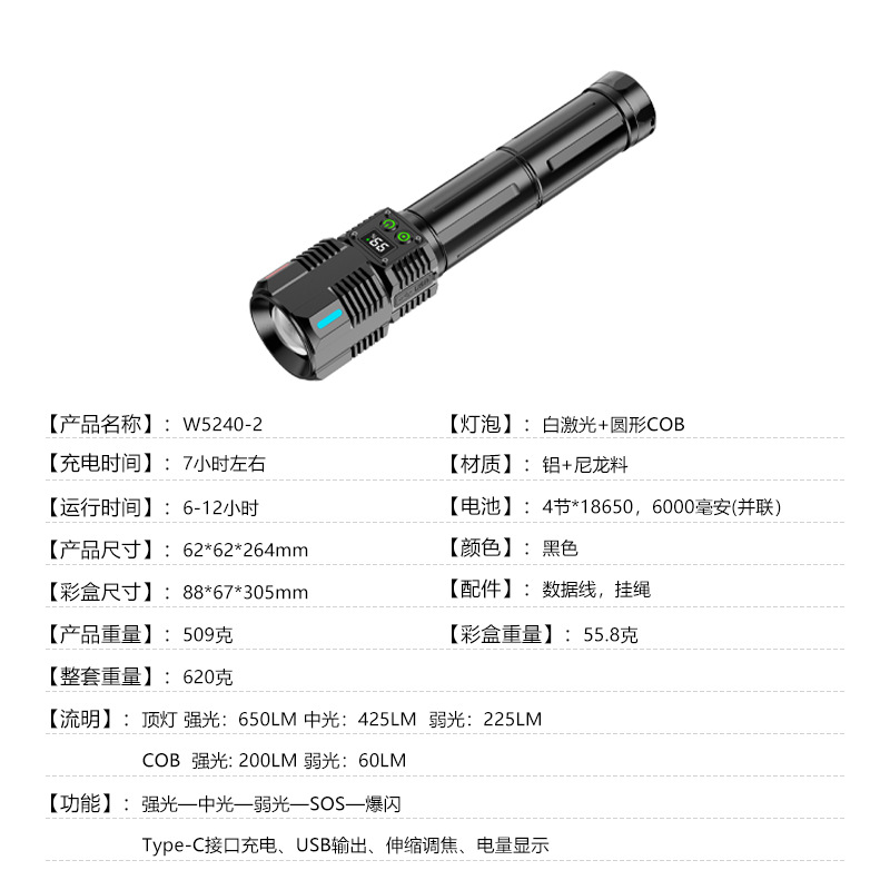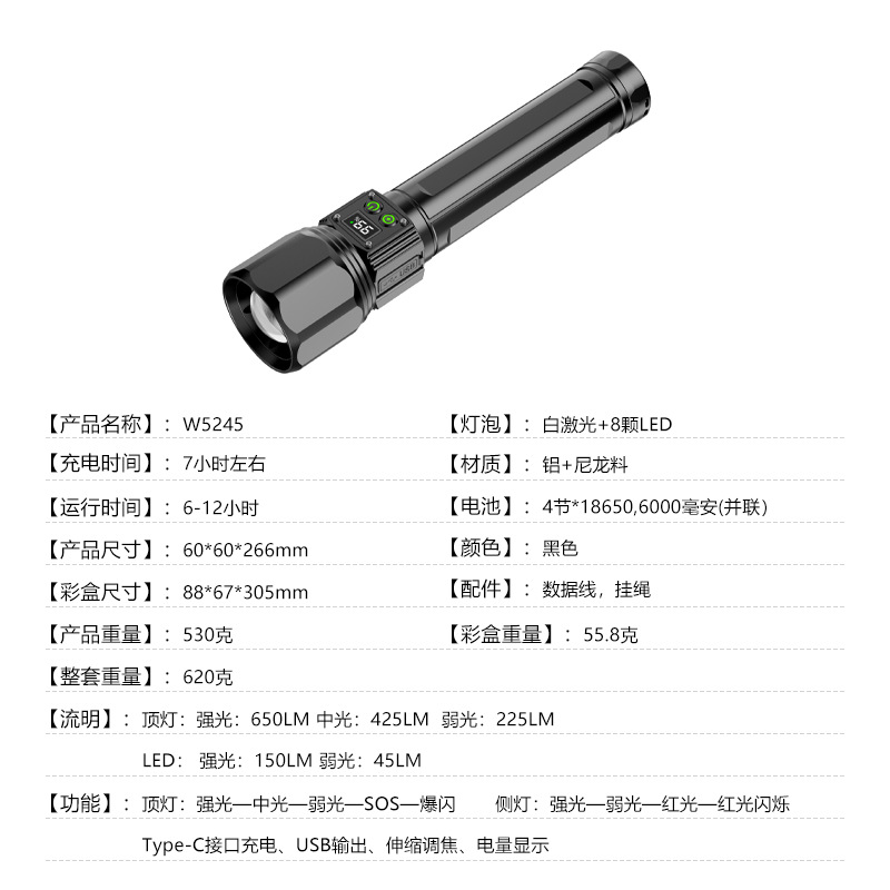 Outdoor high-intensity zoom white laser flashlight with long battery life of 6000 mah, emergency battery level display and cob side light