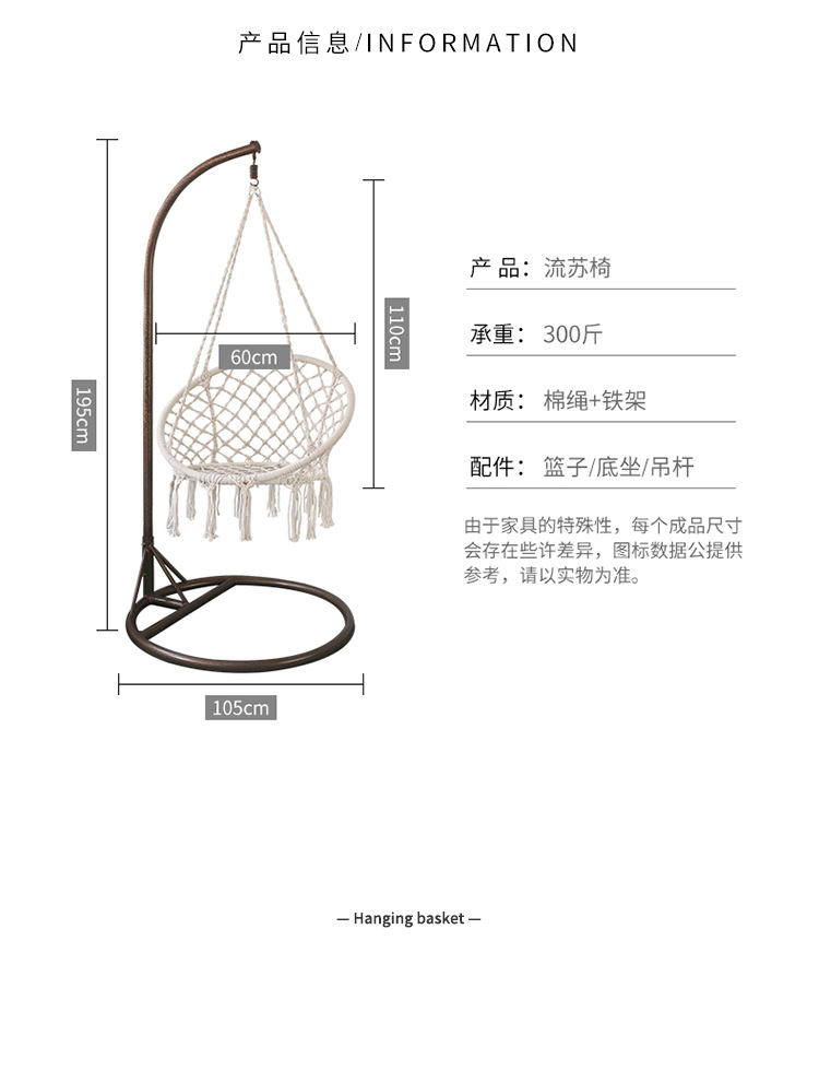 The coffee-colored hanging basket does not include the cushion (120cm high x 80cm large circle x 60cm small circle)