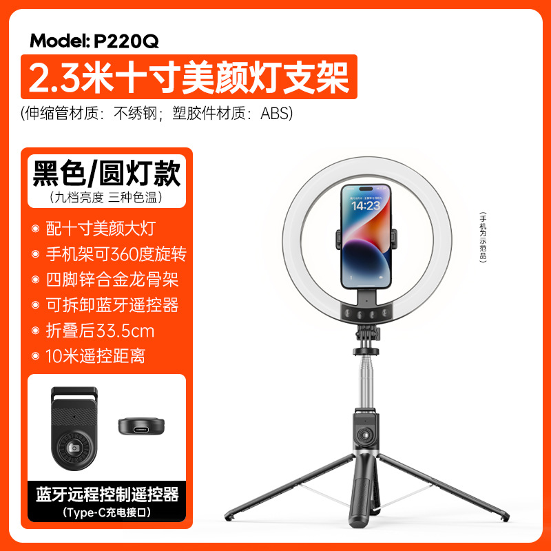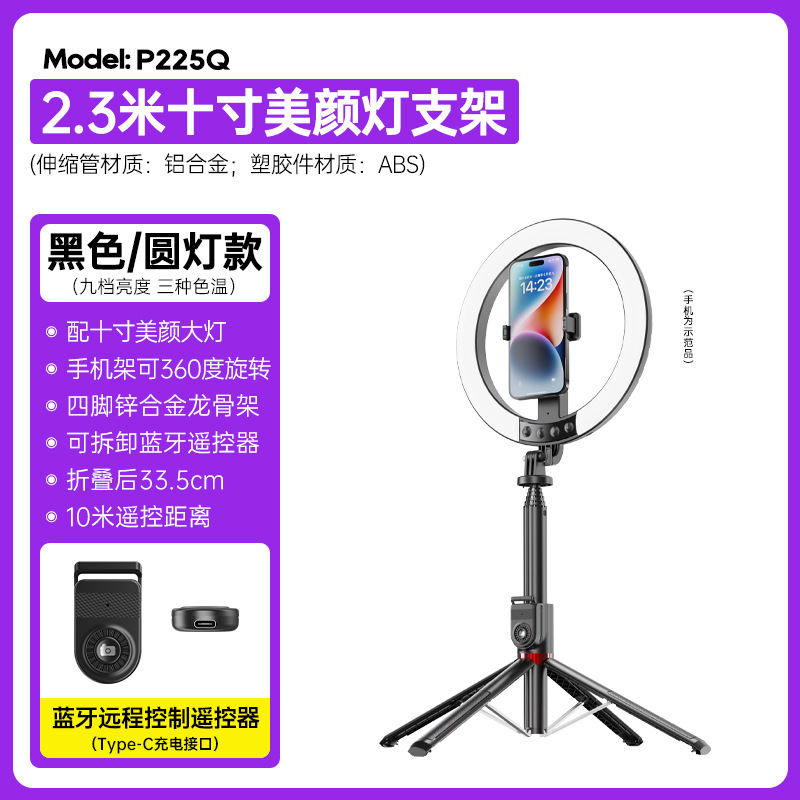 P225Q 10-inch fill light live streaming stand, 2.3-meter extra-long mobile phone selfie stick, Bluetooth remote control live streaming stand