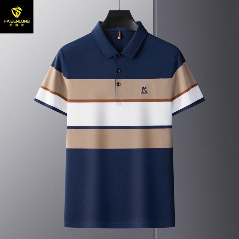 Paisenlong 2023 Mature Middle-aged Men Short-sleeved T-shirt, color-blocking striped lapel Middle-aged Men polo shirt top