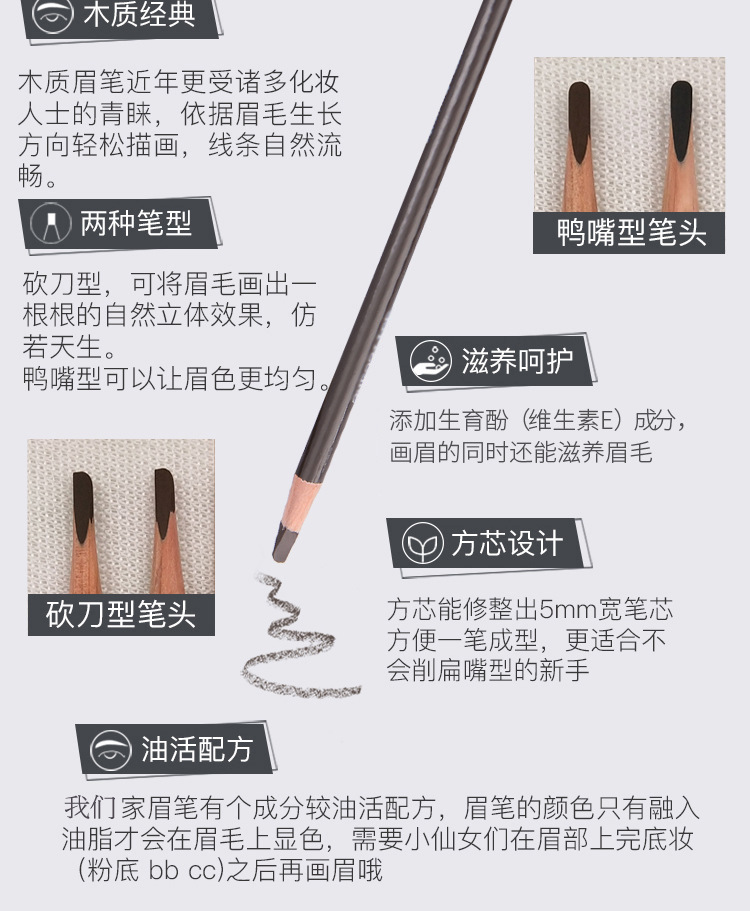 Pen Master's wooden eyebrow pencil with a square core, hard core, knife-cut wooden stem, and a natural misty feel. Pen Master's wooden eyebrow pencil