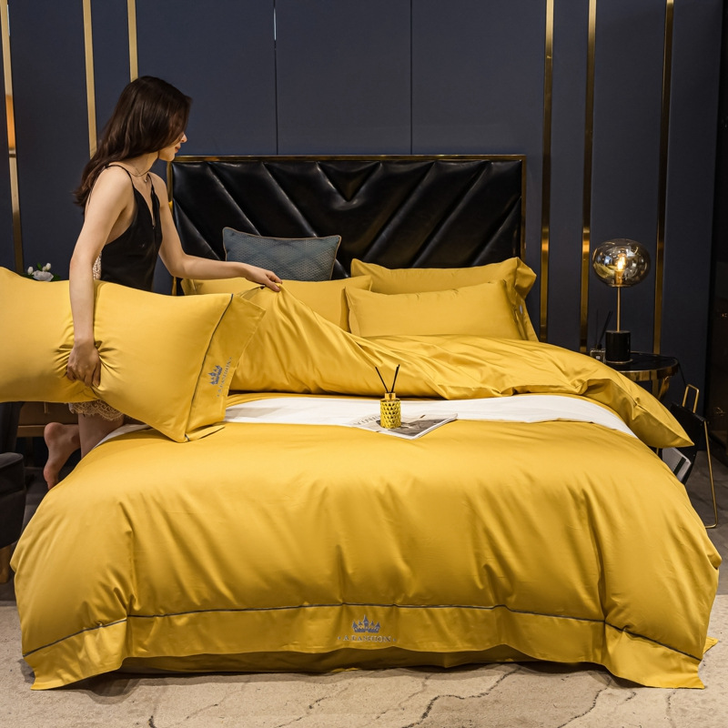 Pure cotton brocade embroidery four-piece set, light luxury plain color 100, all-cotton embroidered bed sheet, duvet cover, bed hat style bedding set