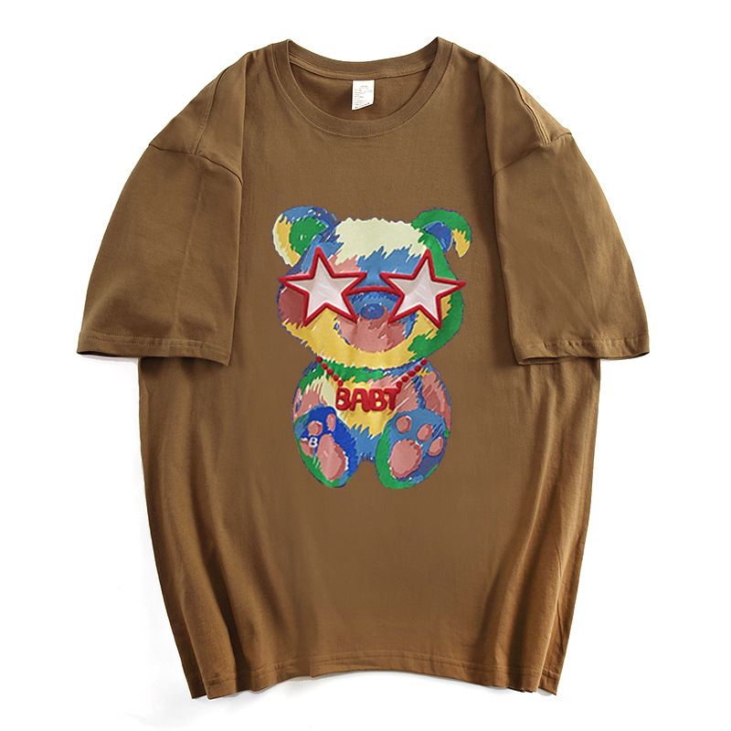 Pure cotton collar one-piece dropshipping summer new short-sleeved T-shirt for women, loose Korean style graffiti bear print short-sleeved top