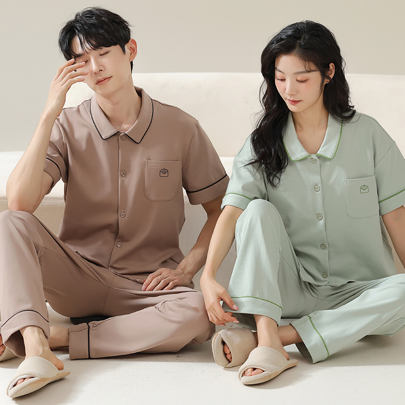 Pure cotton couple pajamas for women in summer, thin short-sleeved cardigan, simple and large-sized, suitable for outerwear. Men's and women's home wear sets