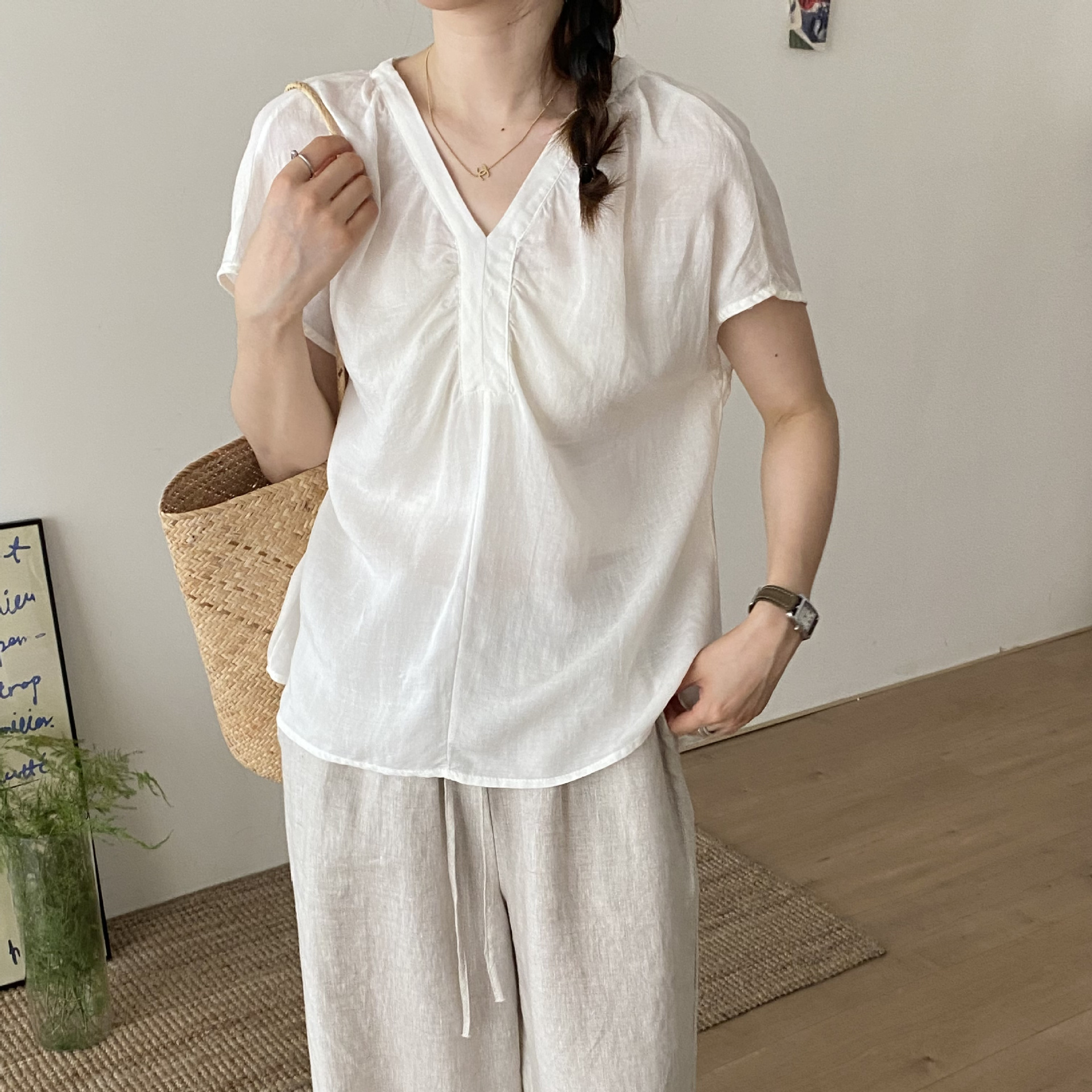Ramie collarless pleated small flapping sleeve women's youthful shirt, summer short-sleeved T-shirt, design sense, unique and beautiful top