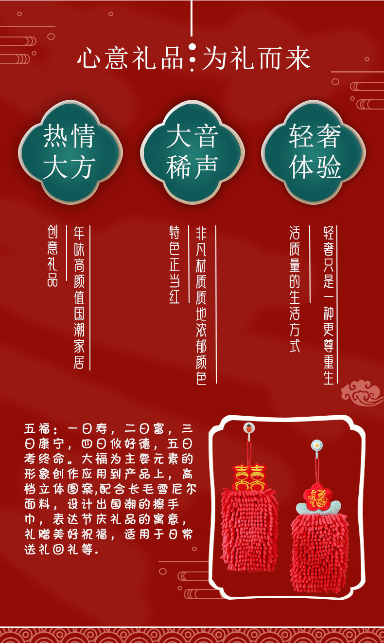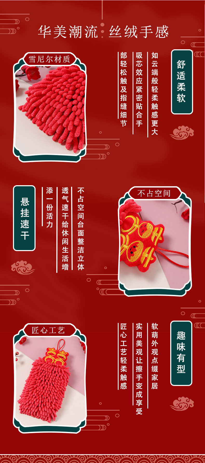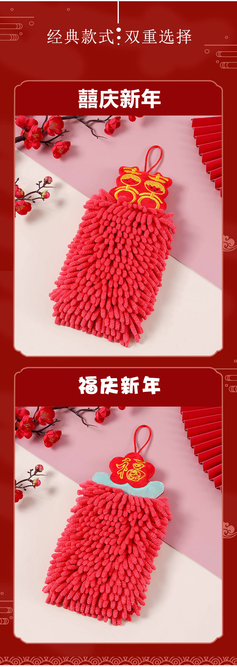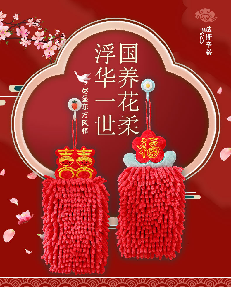 Red festive New Year Chenille hand towels can be hung as children's absorbent hand towels as souvenirs. Happy hand towels
