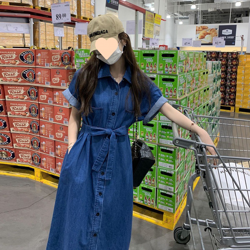 Retro denim dress for women 2023 new summer, thin French style, waist-cinching and slimming shirt MIDI dress