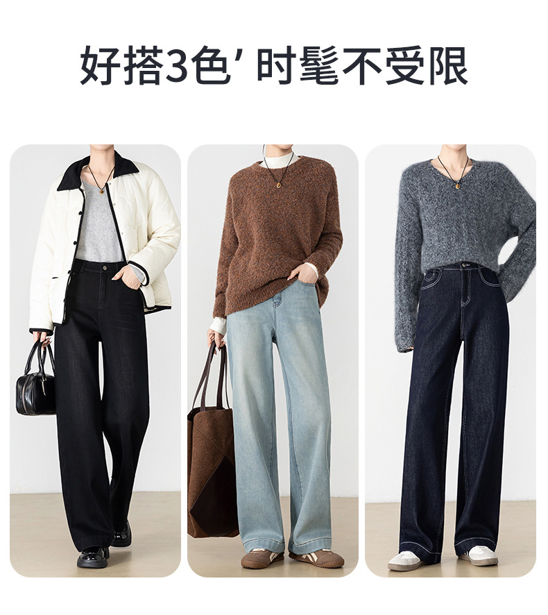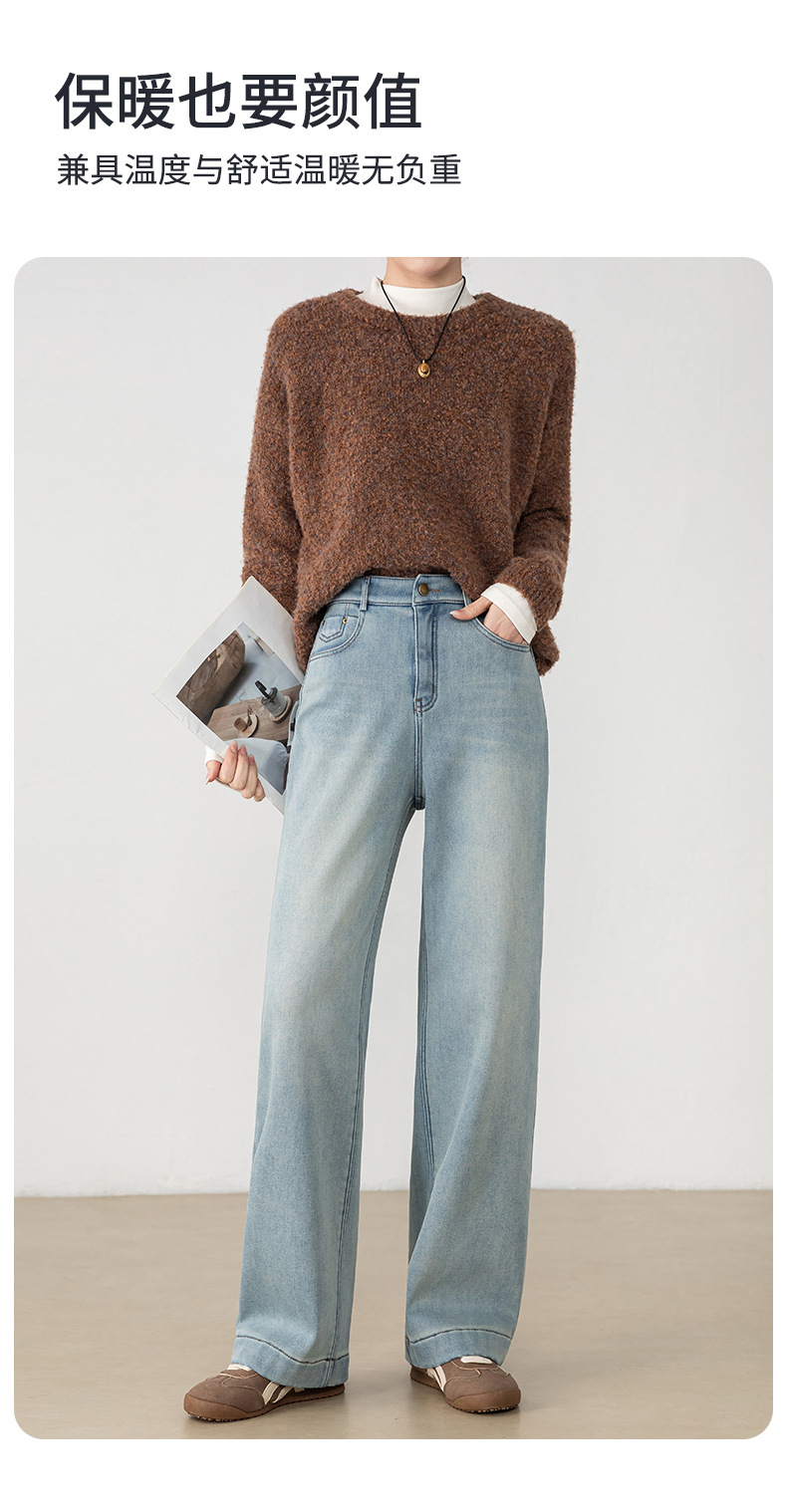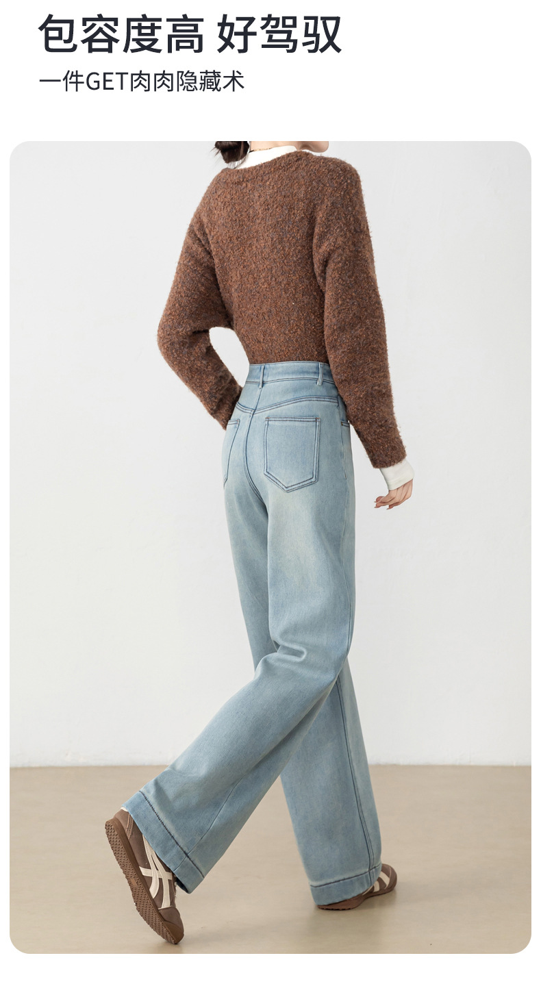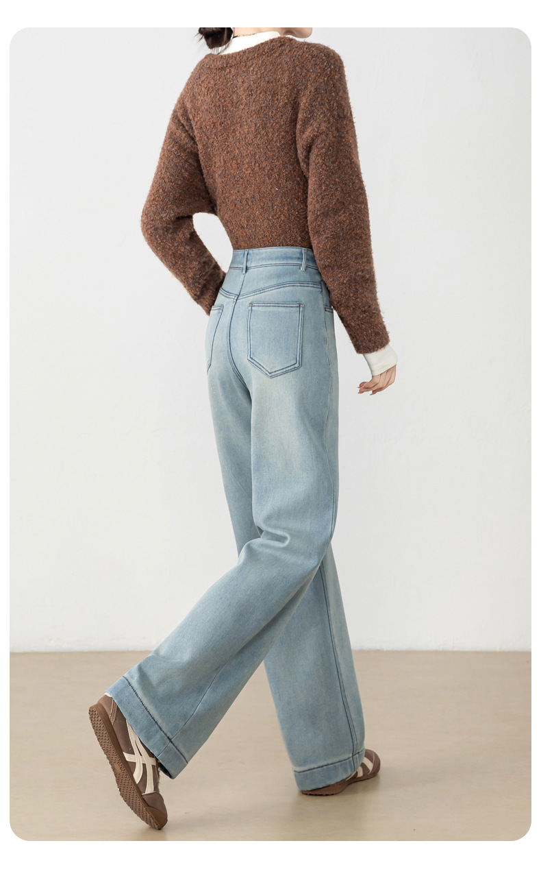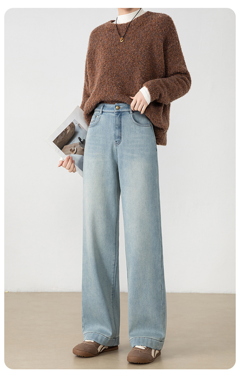 Retro fleece jeans for women's autumn and winter 2025 new high-waisted loose narrow light-colored straight-leg wide-leg pants