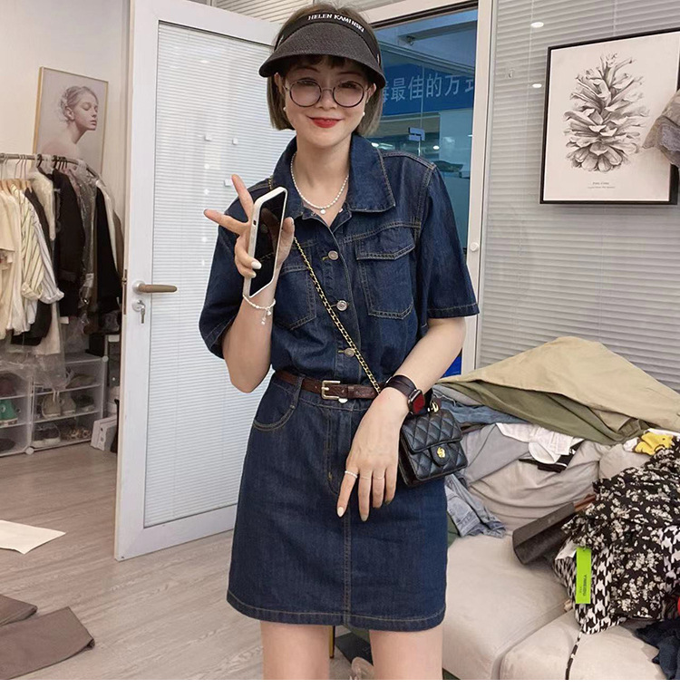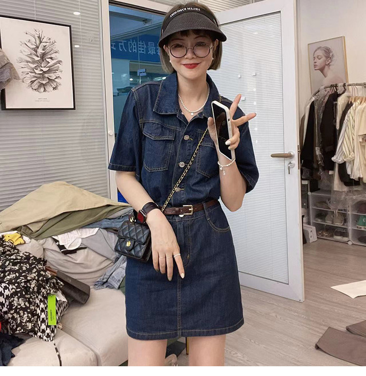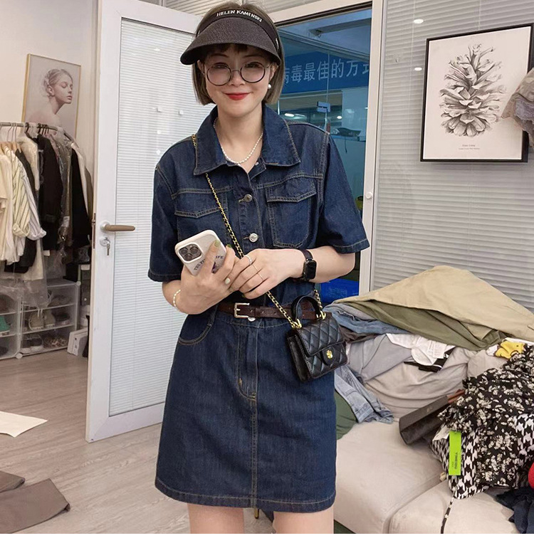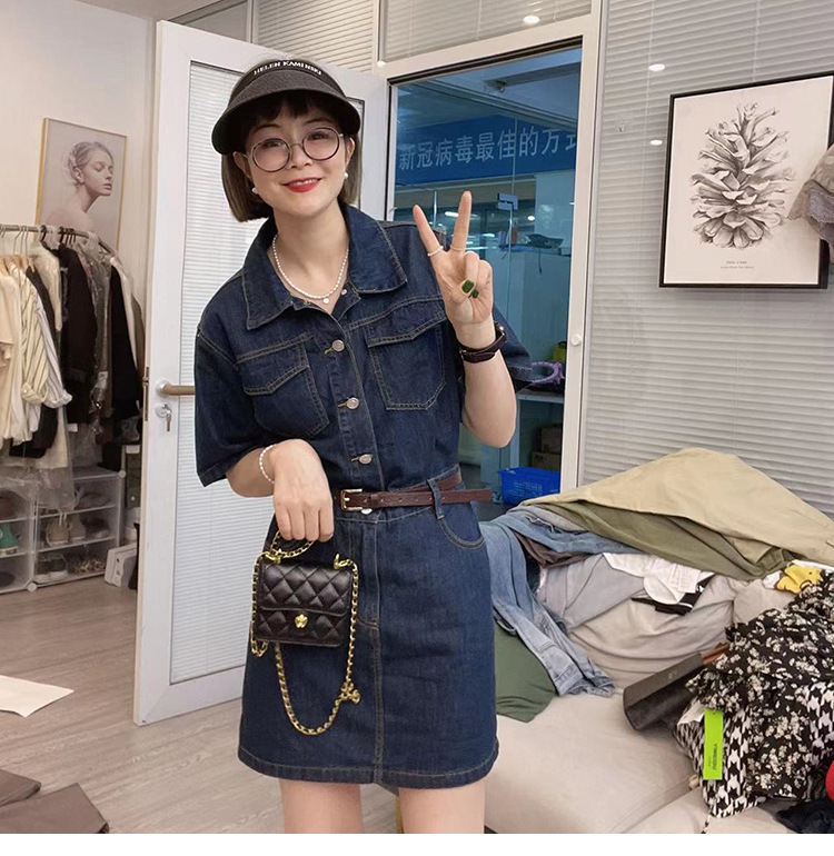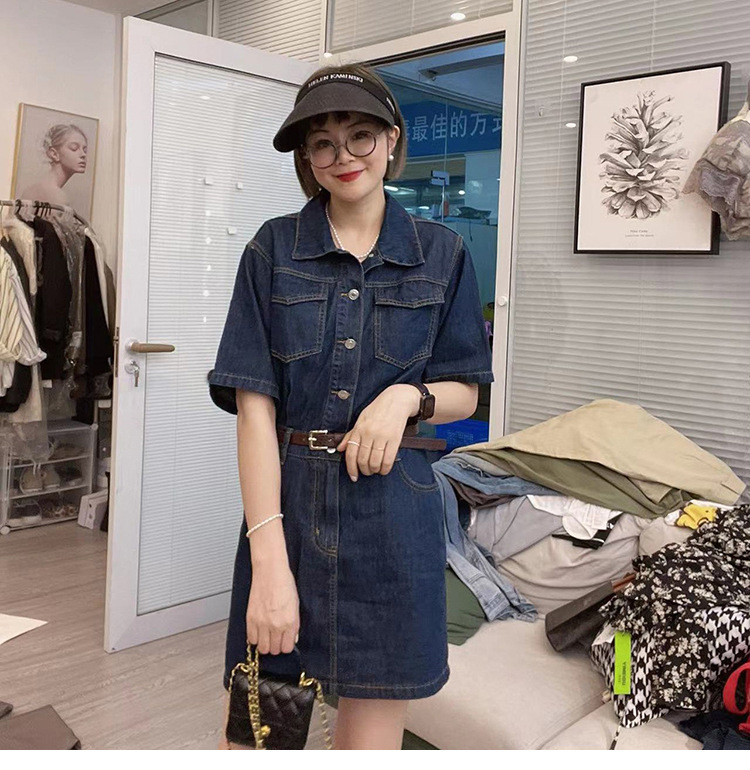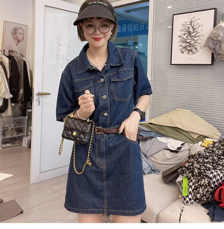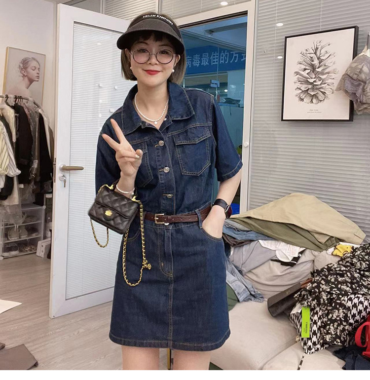 Retro Hong Kong-style plus-size women's dress slimming A-line dress, chubby girl denim dress making tall and waist-cinching short skirt