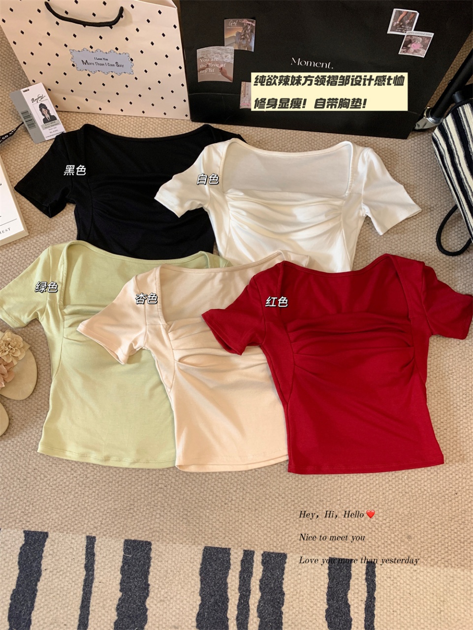 Retro solid color square collar collarbone exposed short-sleeved T-shirt for women, sweet and spicy design, pleated, slimming short top