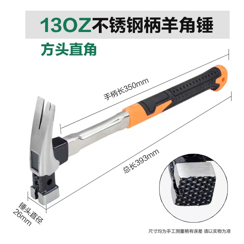 121158, 13oz stainless steel handle ram's horn hammer, square head, right Angle (box 10/ box 40), 0.72kg