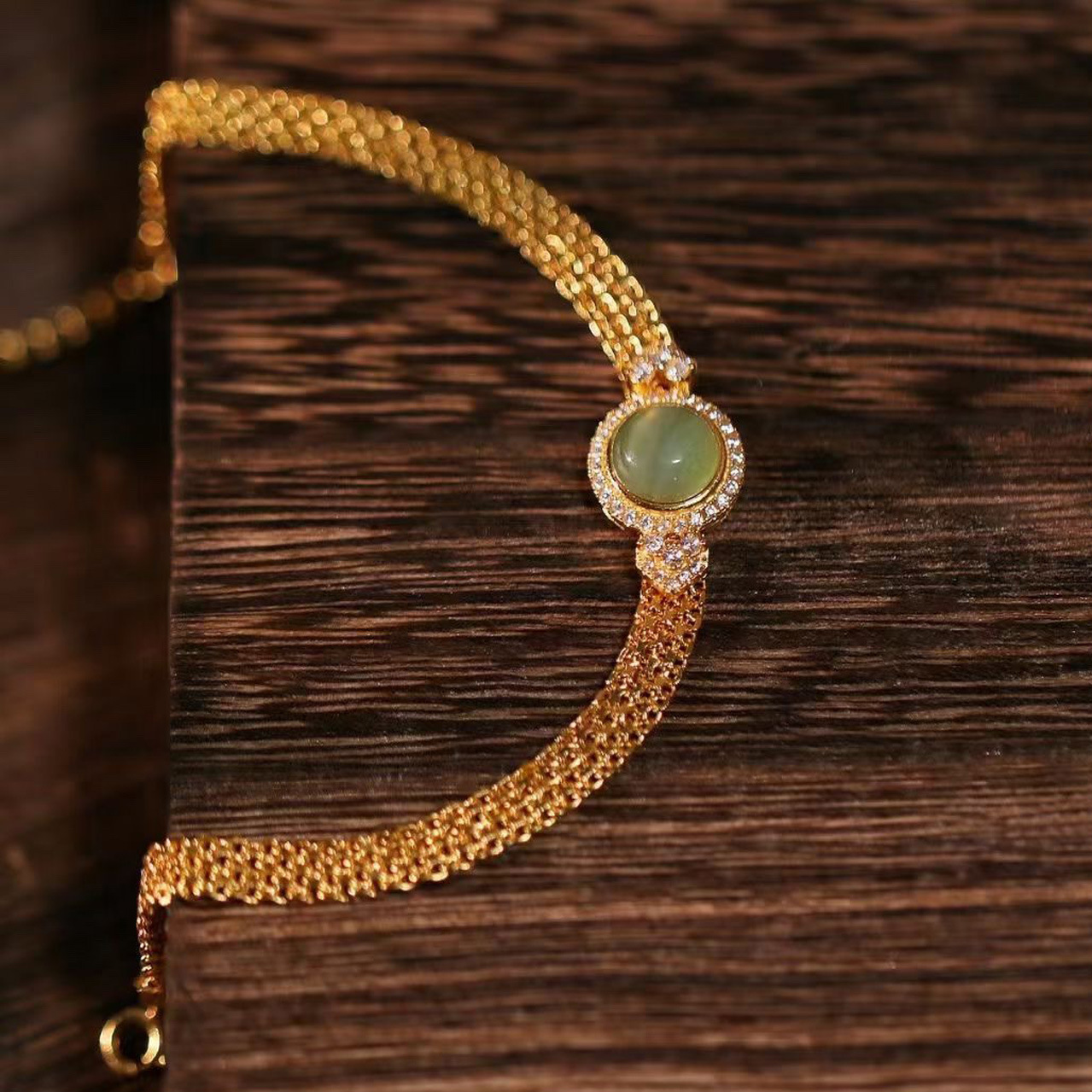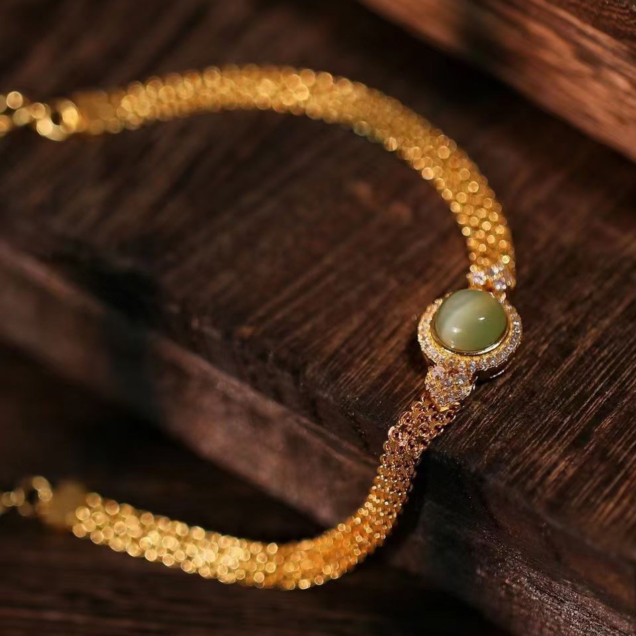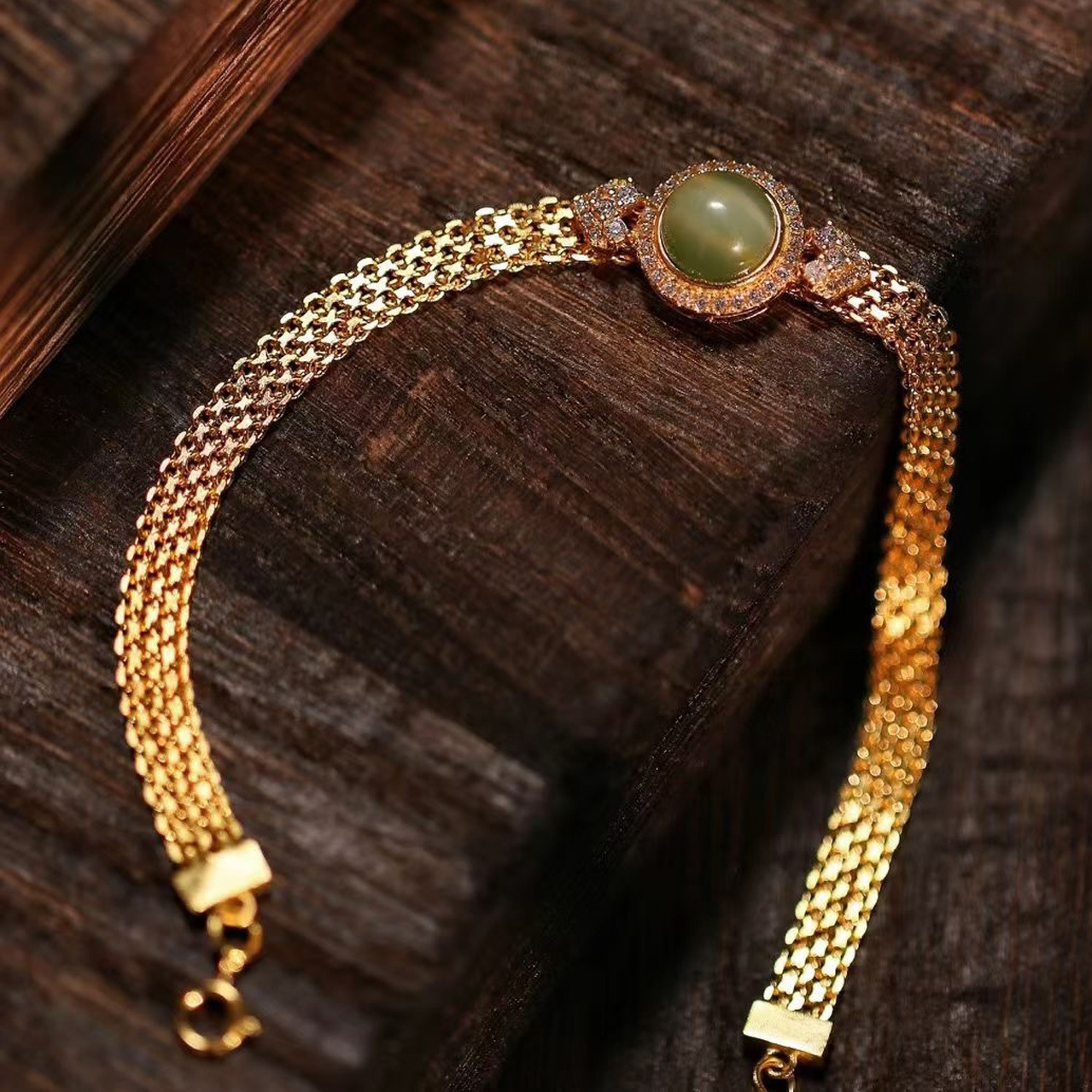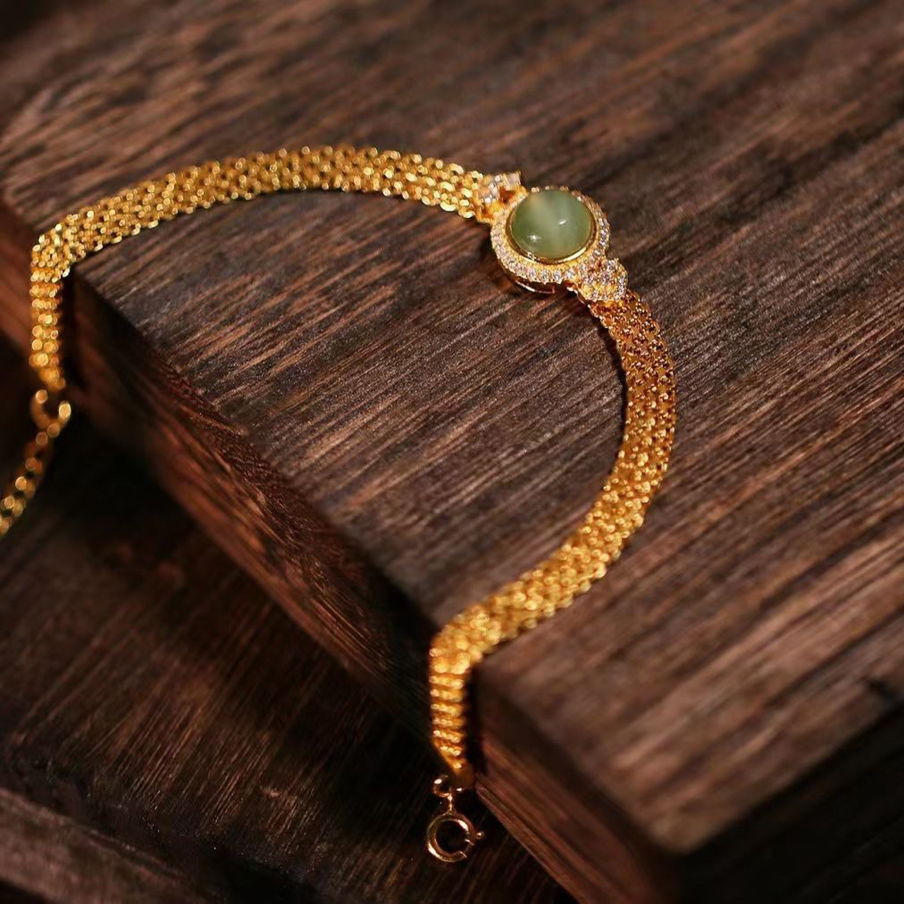 S925 silver gold-plated watch chain inlaid with cat's eye jade, women's retro court-style wide bracelet birthday gift