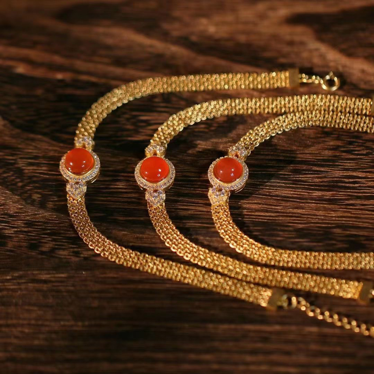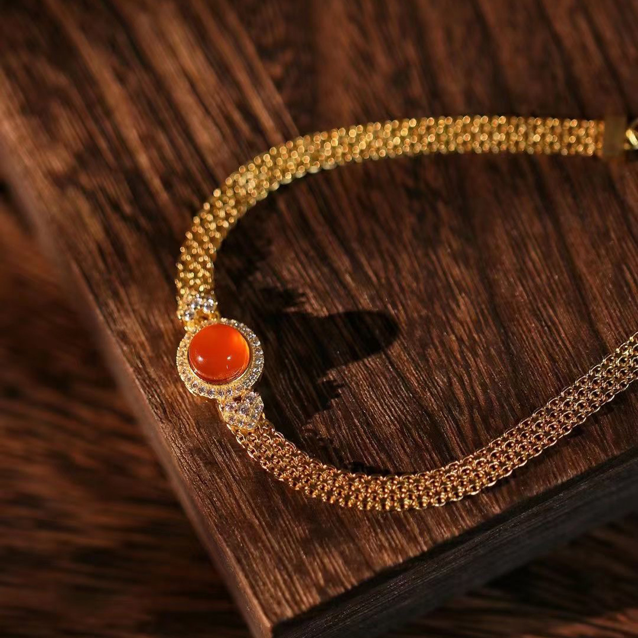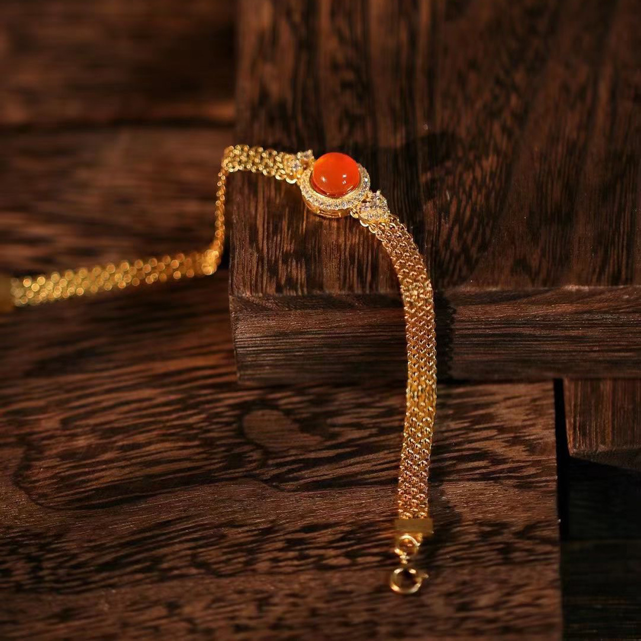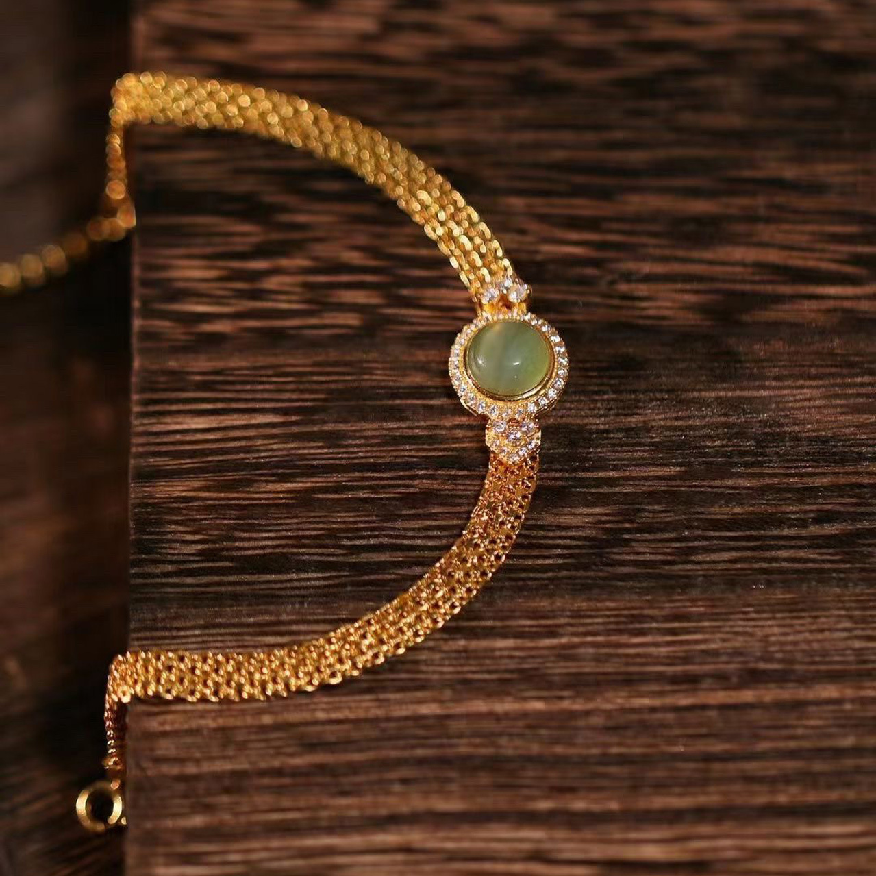 S925 silver gold-plated watch chain inlaid with cat's eye jade, women's retro court-style wide bracelet birthday gift