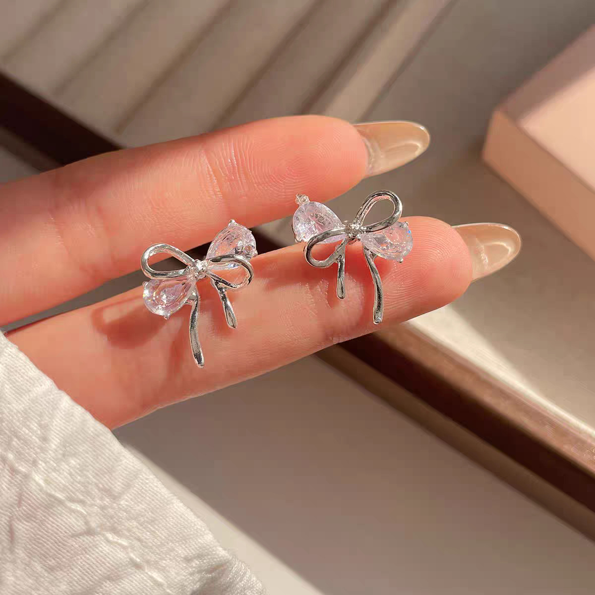 70# White zirconium silver bow ribbon stud earrings