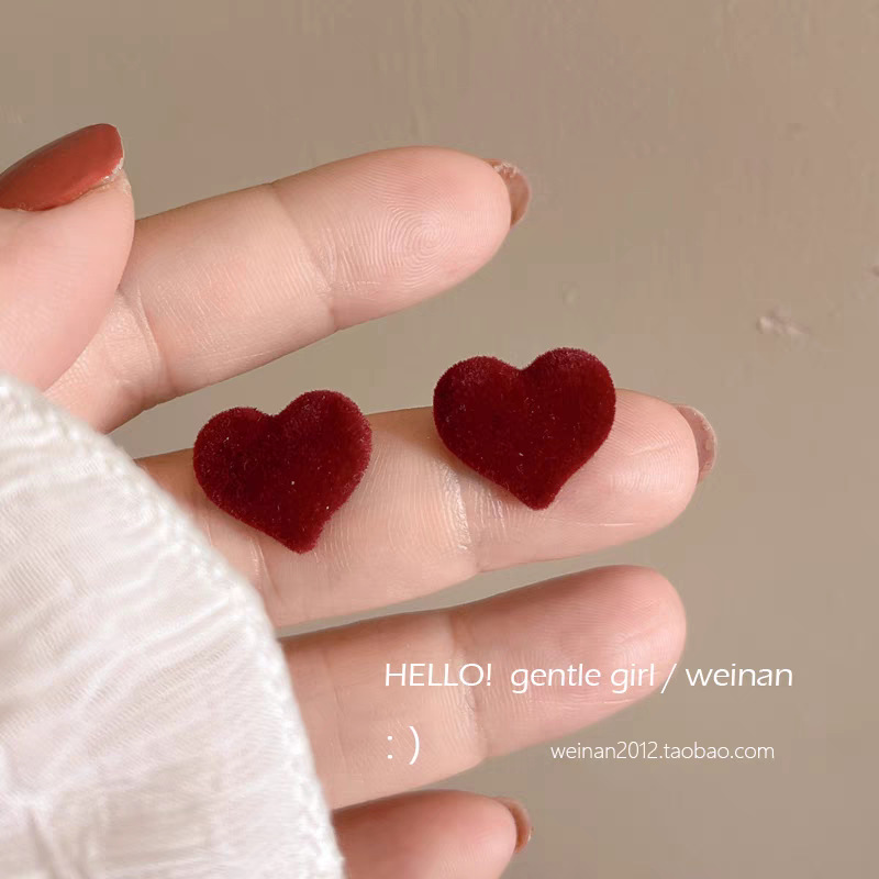 47# Three-dimensional heart-shaped red velvet stud earrings