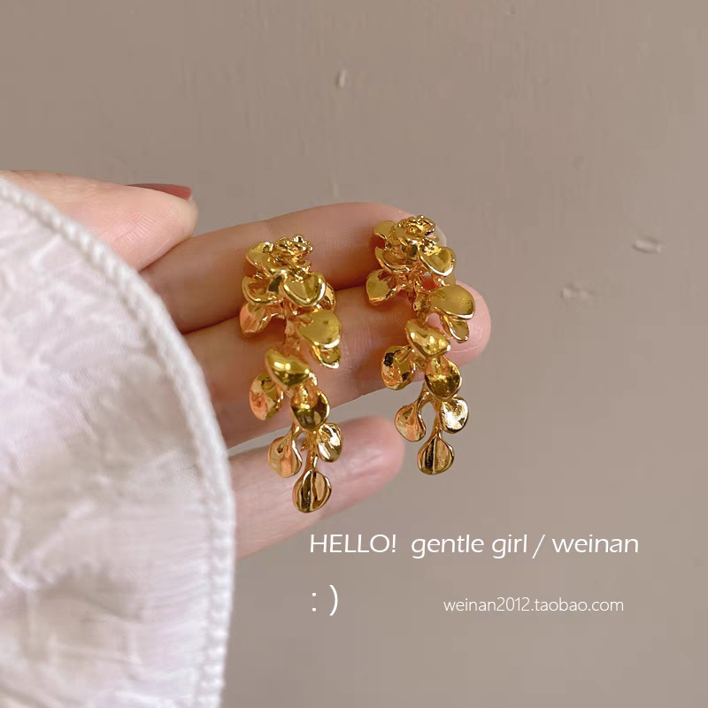 8# Gilded Flower-leafed tassel stud earrings