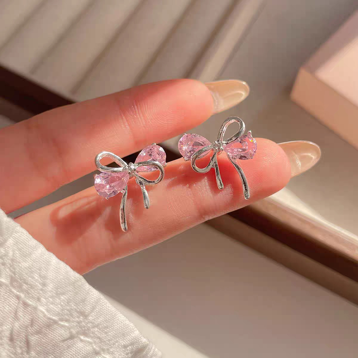 69# Pink zircon silver bow ribbon stud earrings
