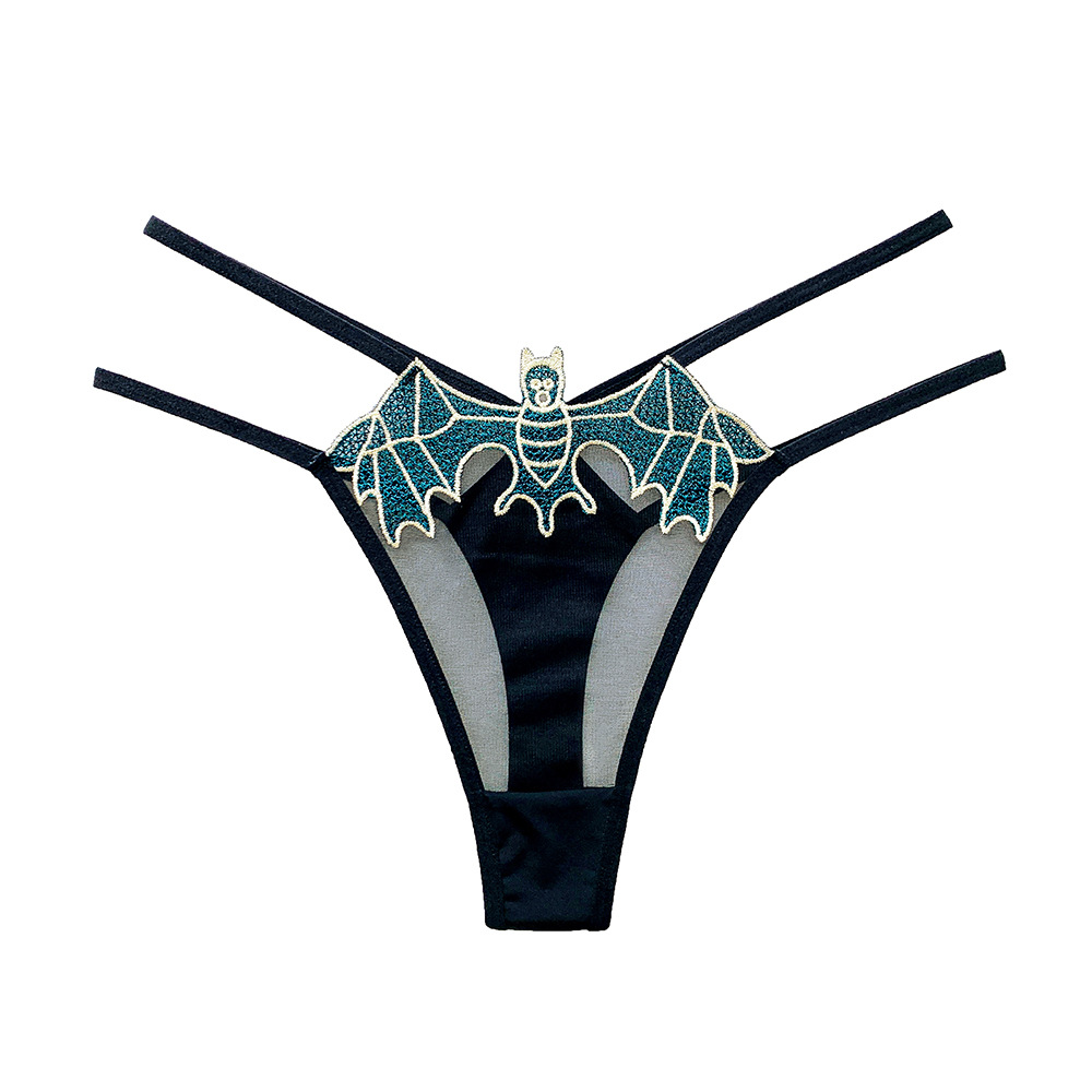 Sexy thong women's bat-themed, shiny embroidered thin ribbons, cut-out transparent chiffon, seductive and romantic girls' underwear