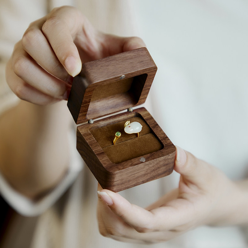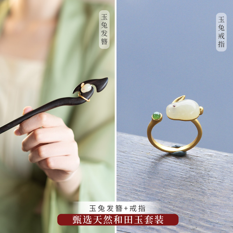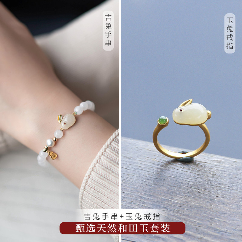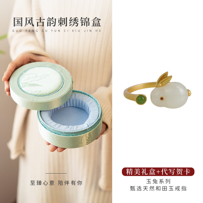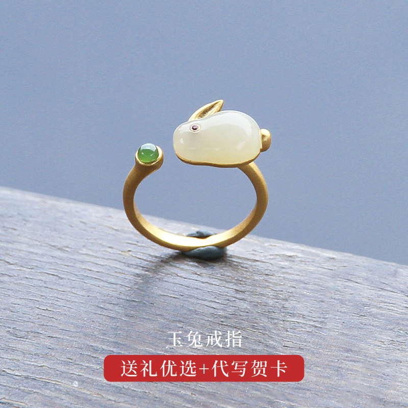 Shanchi Ancient-style jade Rabbit Hetian jade ring for girls, rabbit jade for girlfriends, pure silver retro Chinese-style open tail ring
